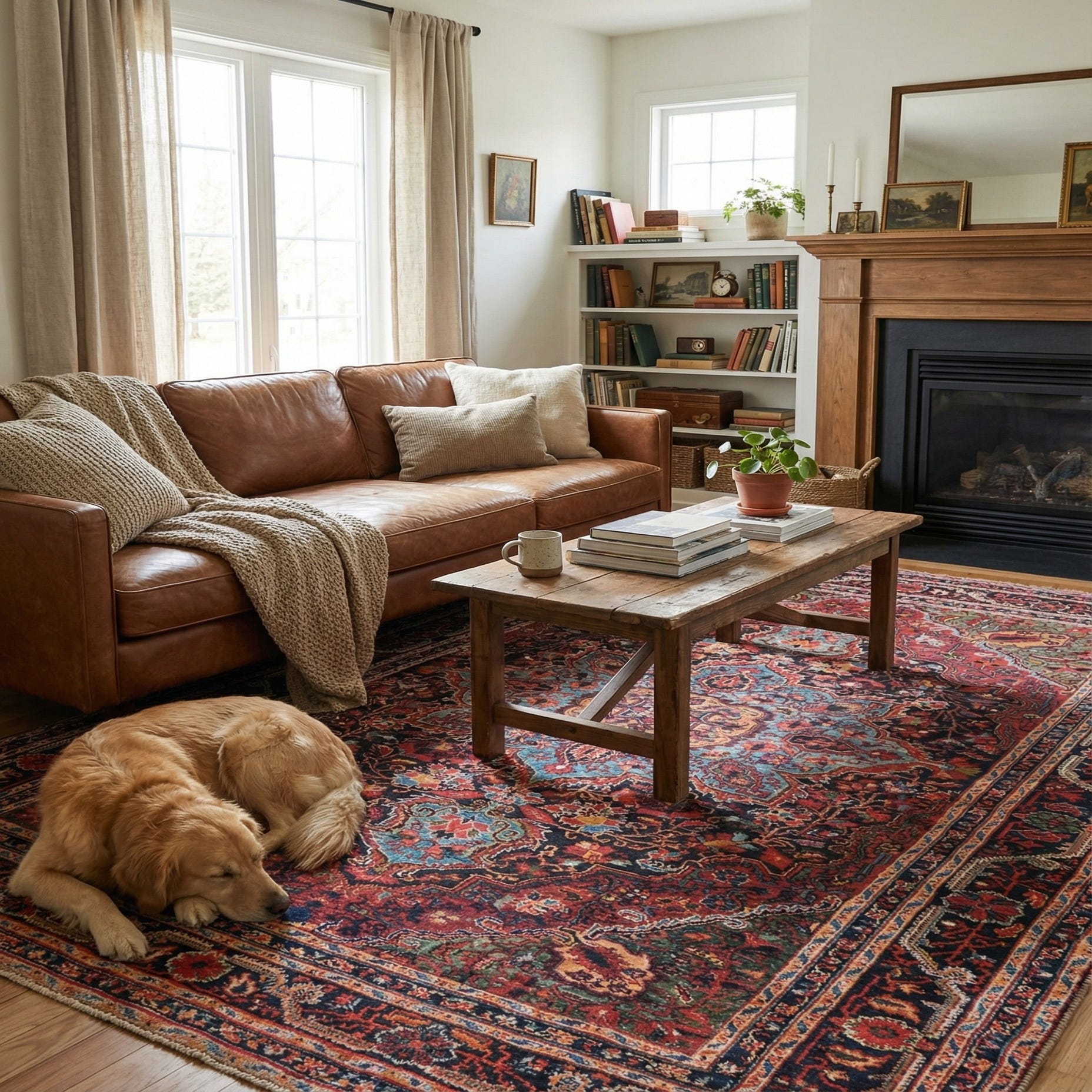 Primary color is Burgundy. Colors in this rug include: Burgundy, Beige, Black, Blue, Brown, Green, Ivory, Yellow.