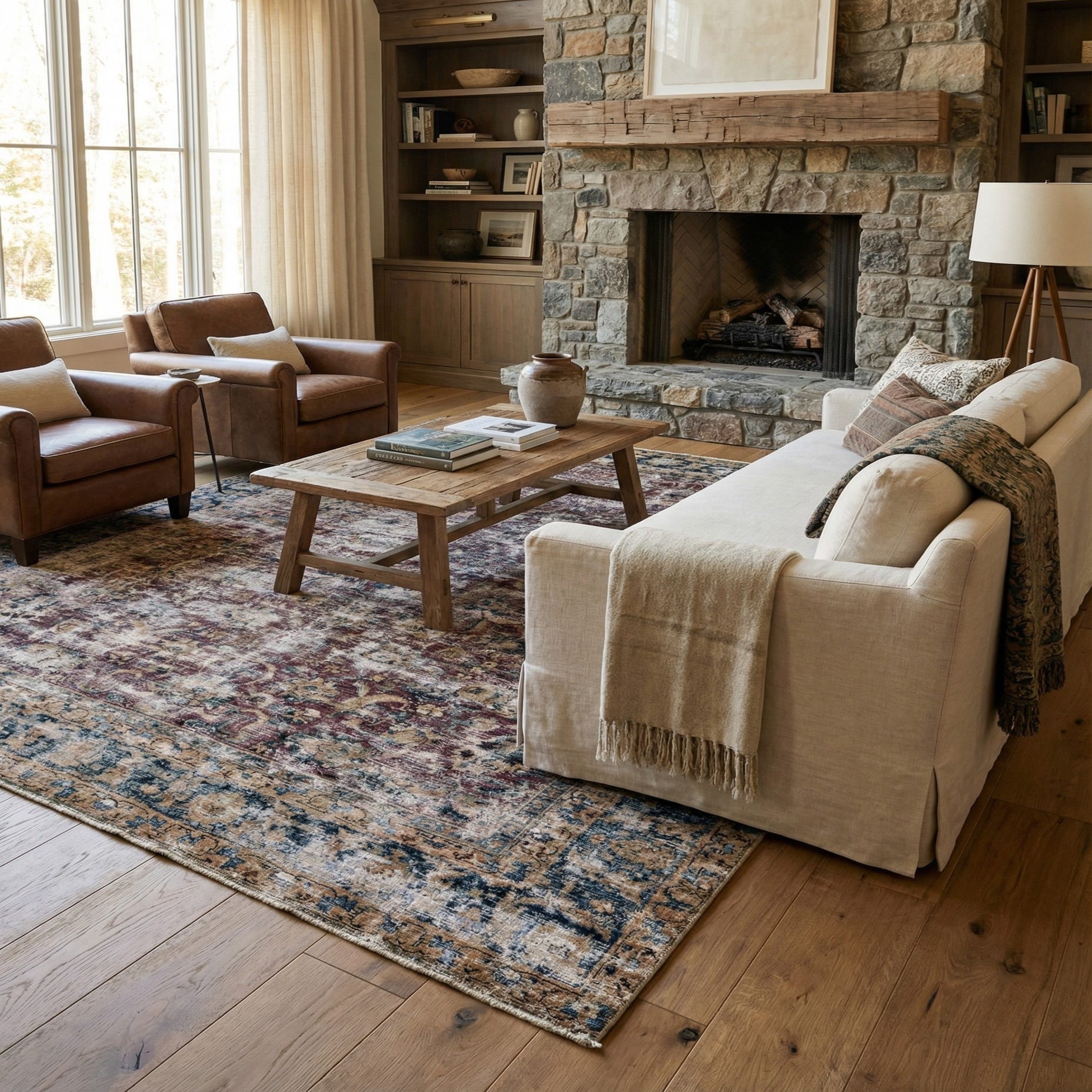 Primary color is Burgundy. Colors in this rug include: Burgundy, Brown, Navy Blue, Ivory, Beige.
