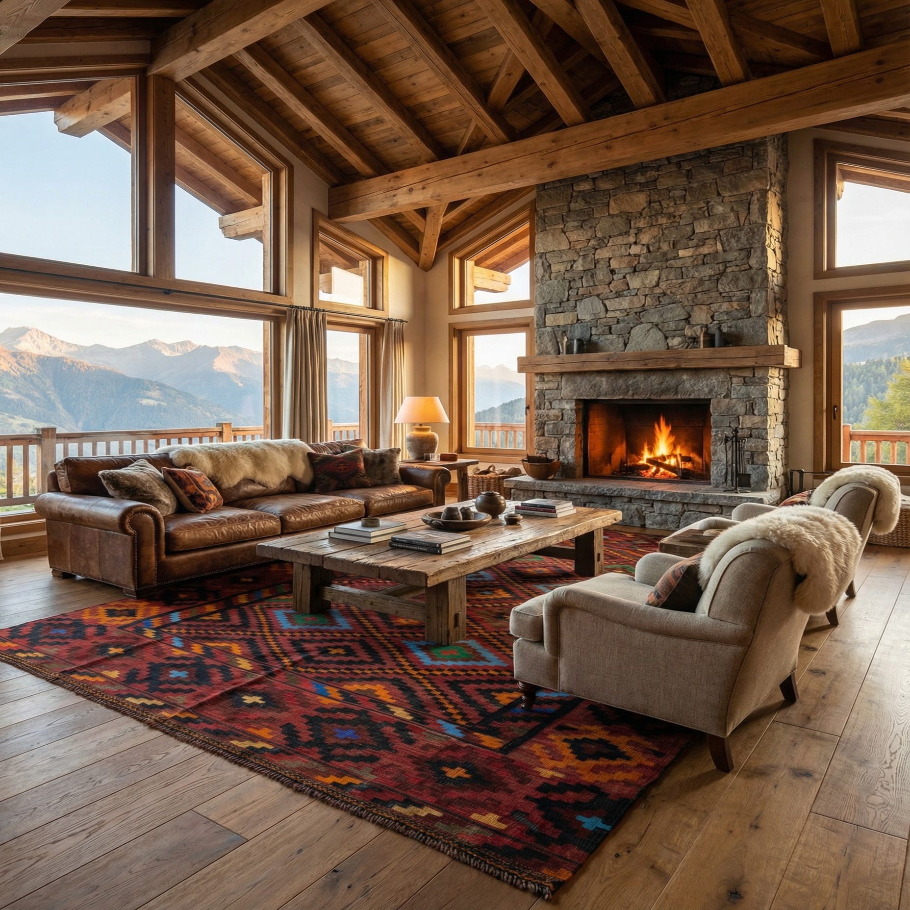 Primary color is Burgundy. Colors in this rug include: Burgundy, Black, Blue, Green, Orange, Yellow.