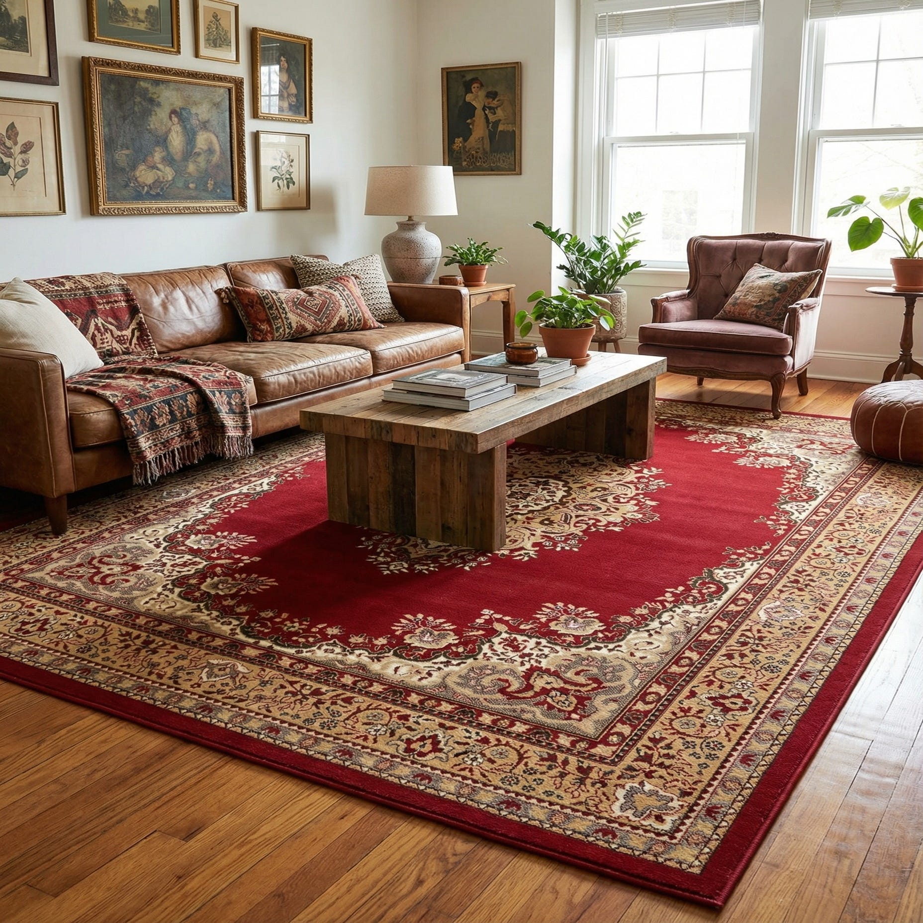 Primary color is Burgundy. Colors in this rug include: Burgundy, Black, Brown, Cream, Red, Tan.
