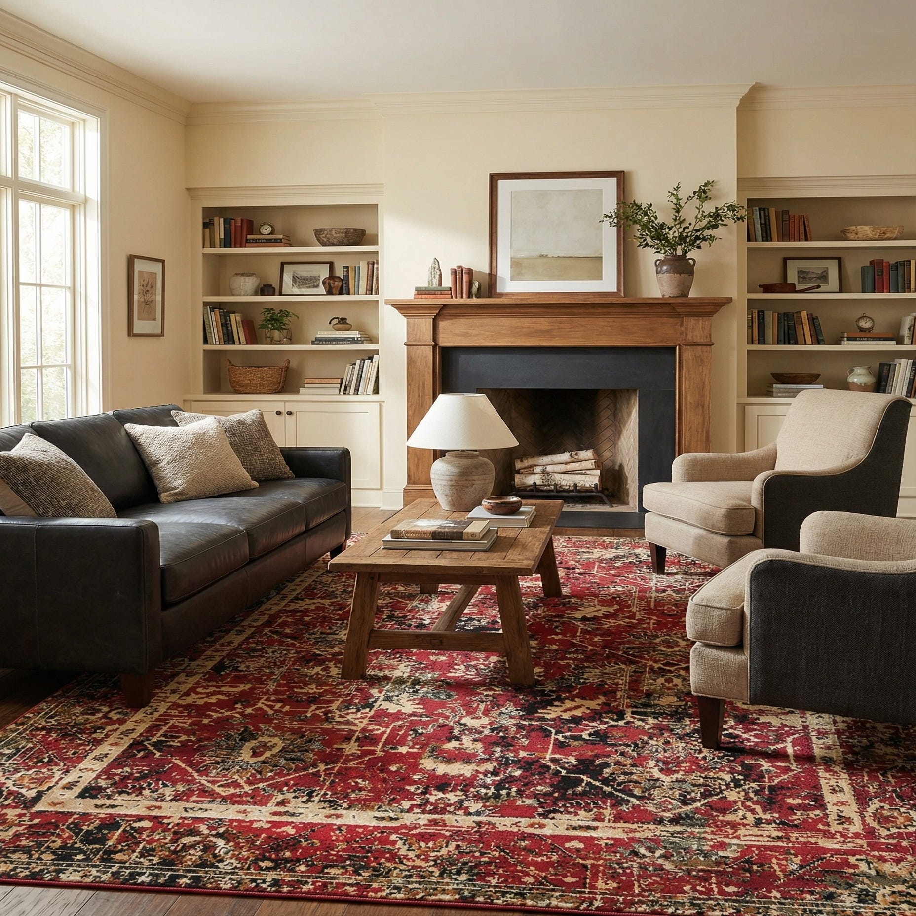 Primary color is Burgundy. Colors in this rug include: Burgundy, Beige, Black, Brown, Gold, Gray.