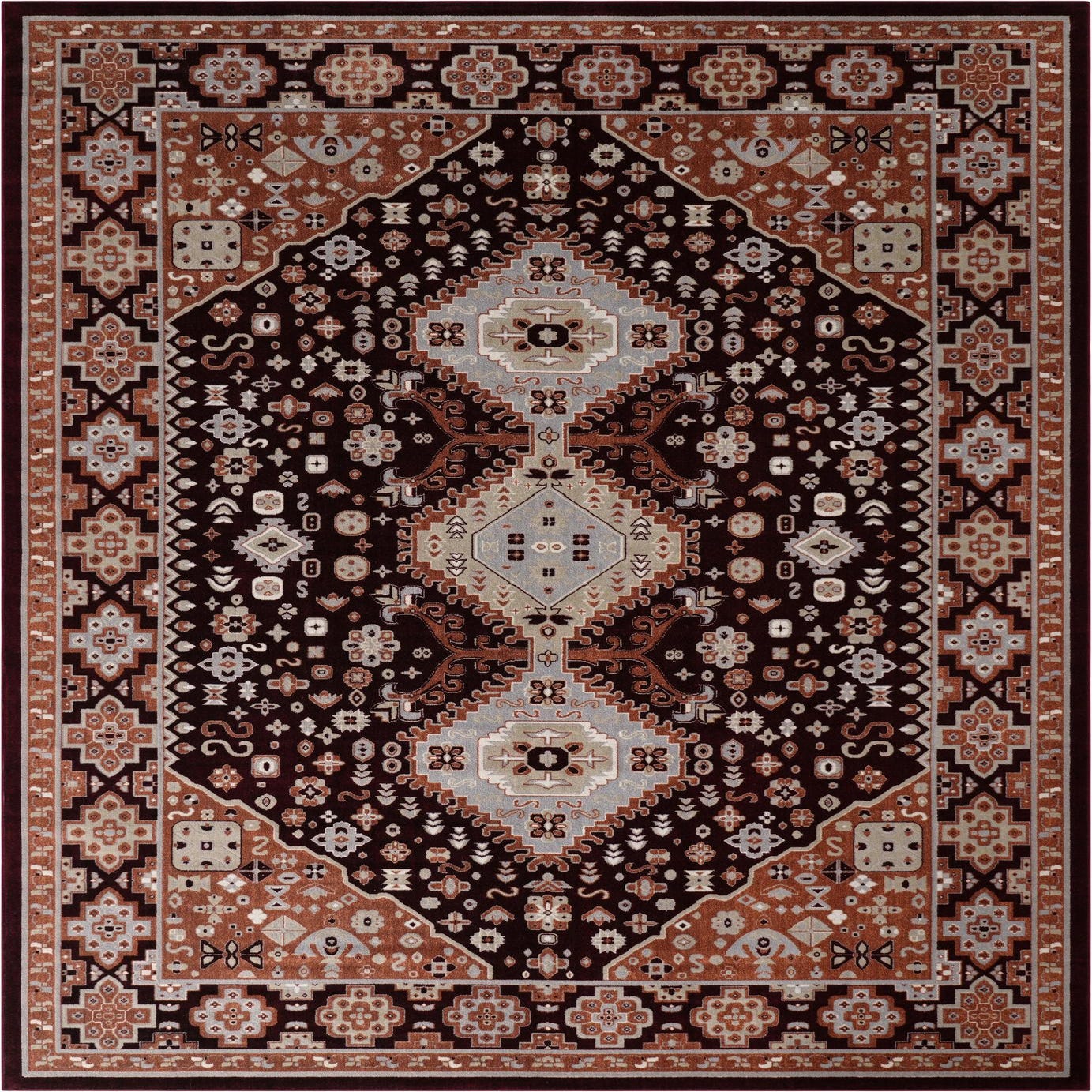 Primary color is Burgundy Red. Colors in this rug include: Burgundy Red, Gray, Ivory, Terracotta.