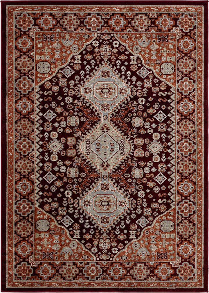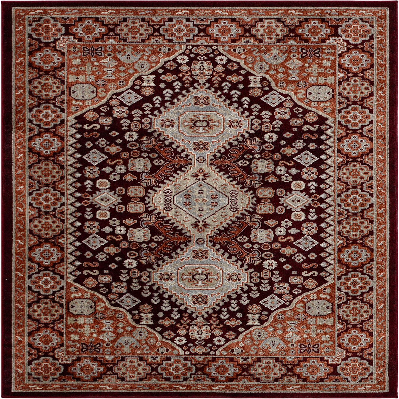 Primary color is Burgundy Red. Colors in this rug include: Burgundy Red, Gray, Ivory, Terracotta.