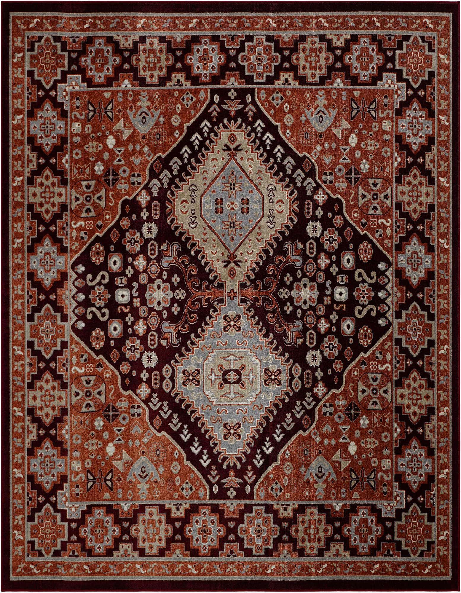 Primary color is Burgundy Red. Colors in this rug include: Burgundy Red, Gray, Ivory, Terracotta.