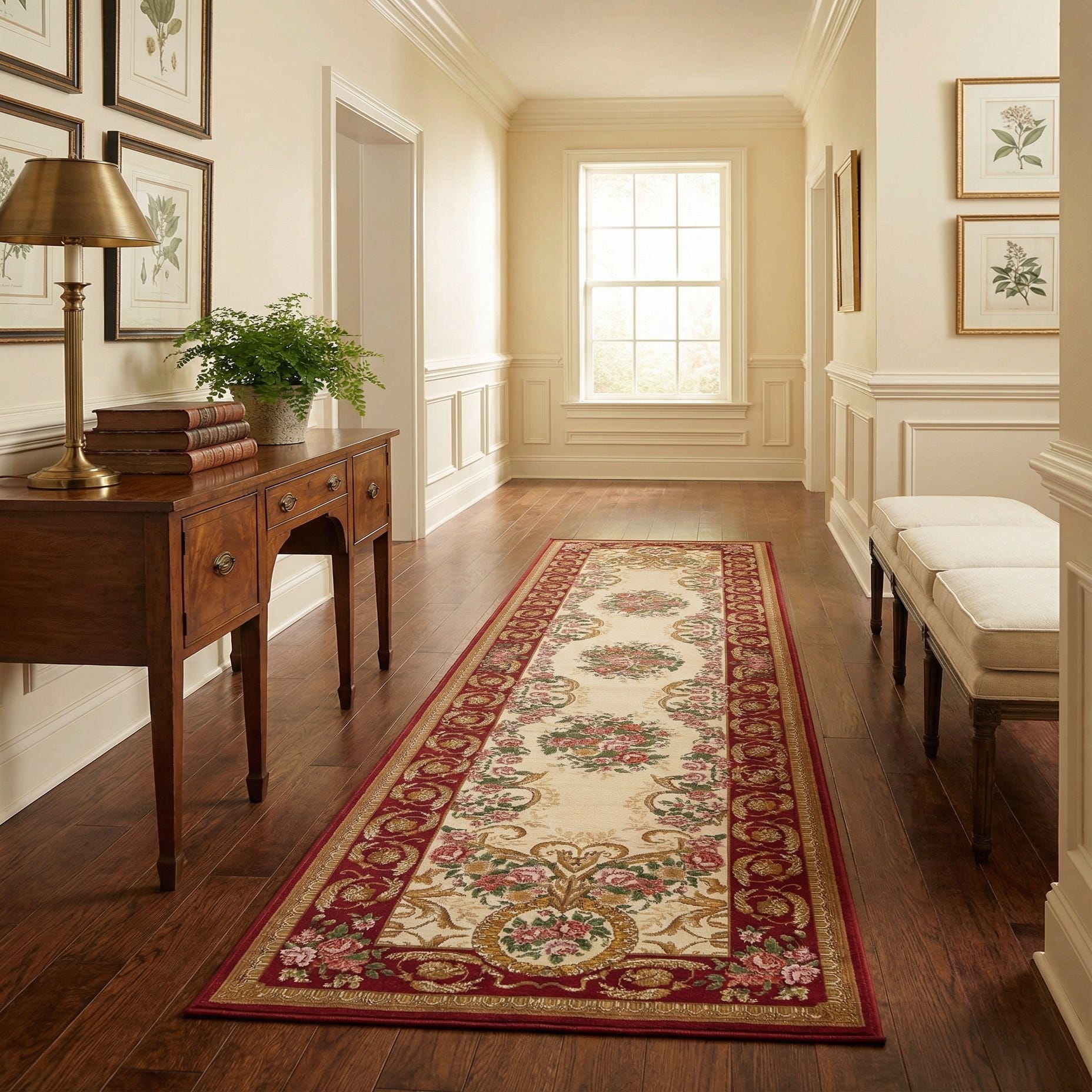 Primary color is Burgundy Red and Ivory. Colors in this rug include: Burgundy Red and Ivory, Gold, Green, Ivory, Red, Pink.