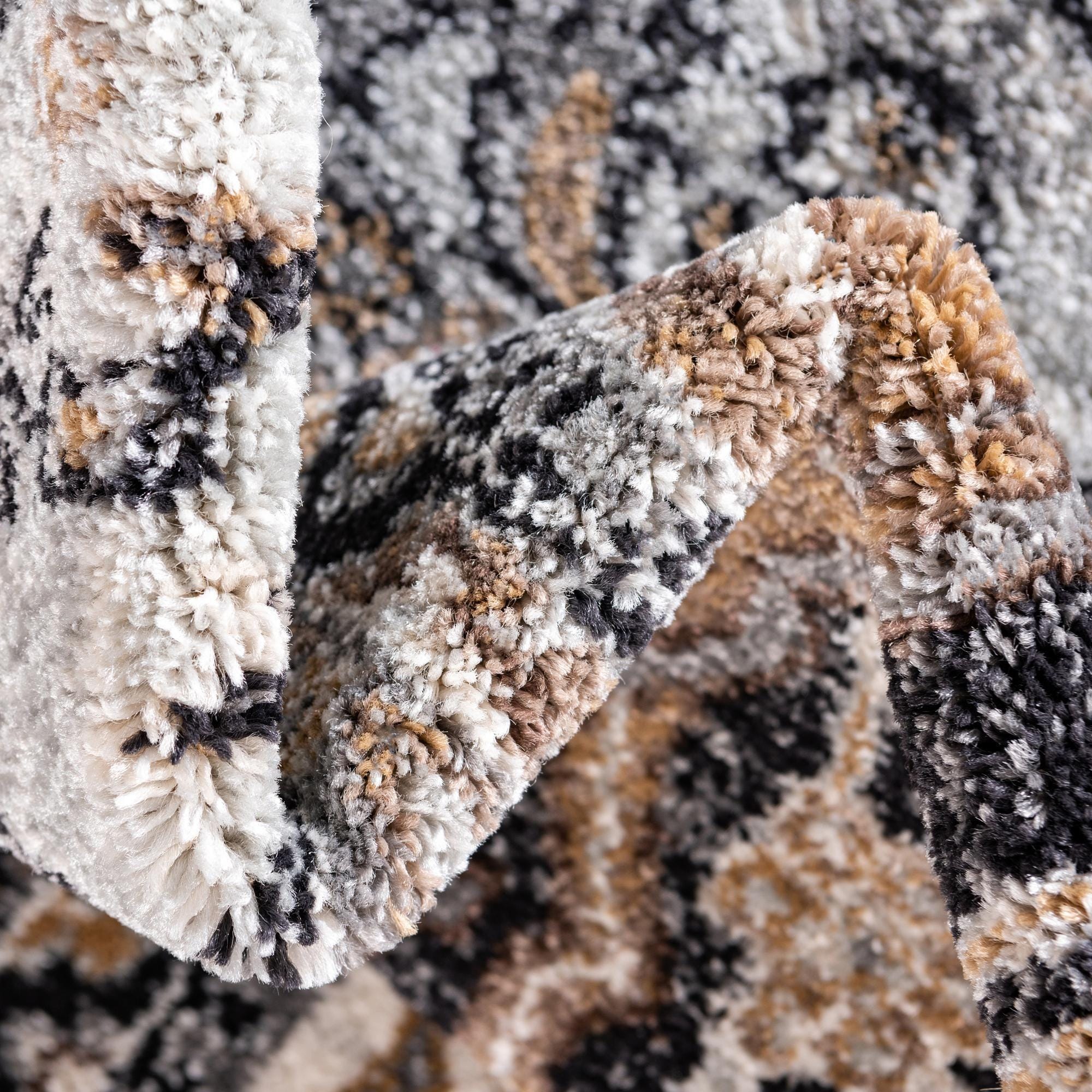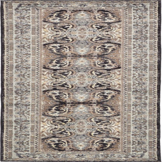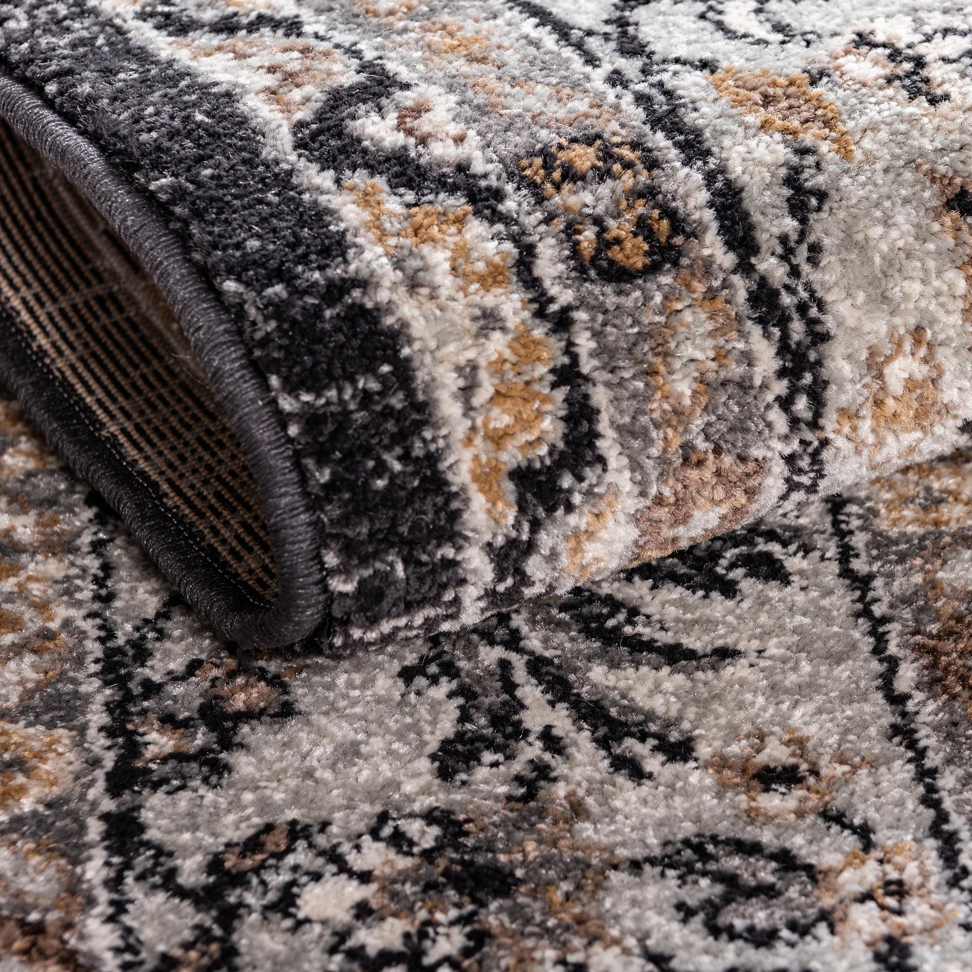 Primary color is Charcoal. Colors in this rug include: Charcoal, Black, Light Brown, Tan, Silver.