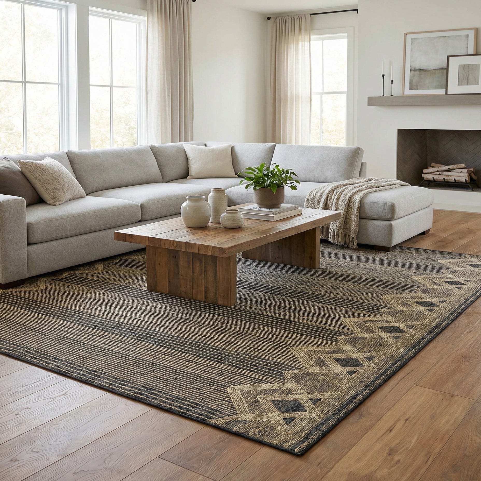 Primary color is Charcoal. Colors in this rug include: Charcoal, Ivory, Gray, Yellow.