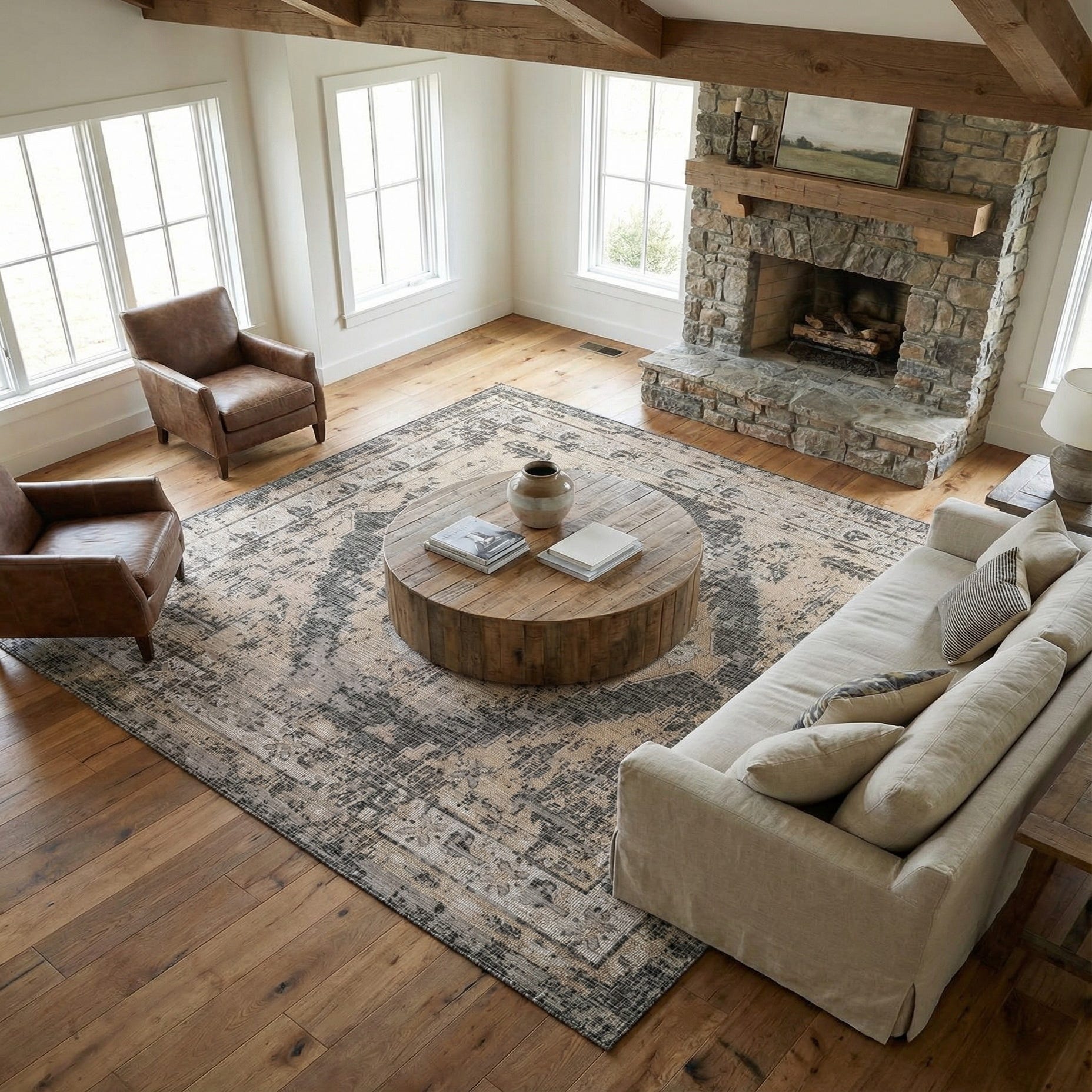Primary color is Charcoal. Colors in this rug include: Charcoal, Beige, Ivory.