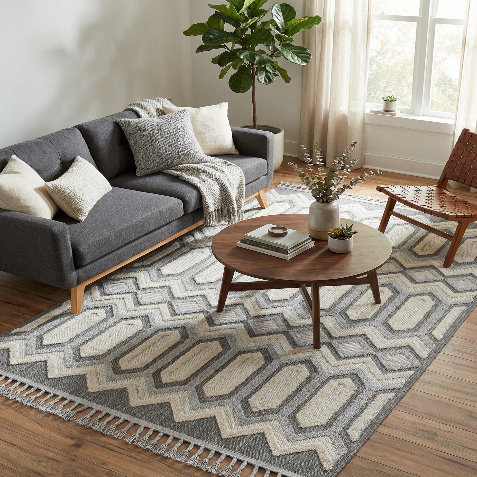 Primary color is Charcoal. Colors in this rug include: Charcoal, Beige, Gray.