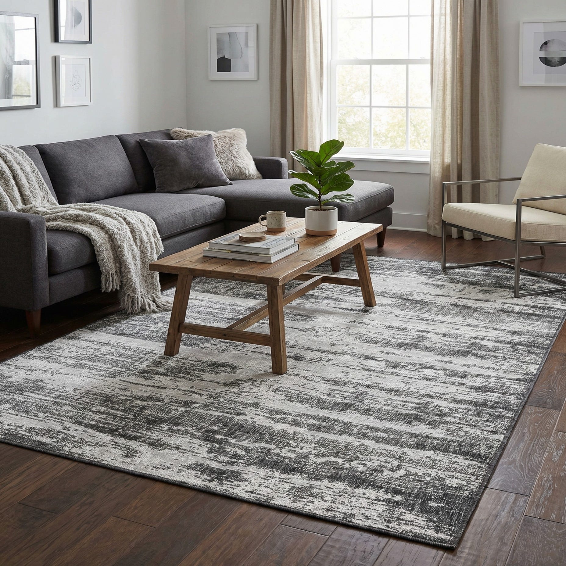 Primary color is Charcoal. Colors in this rug include: Charcoal, Ivory.