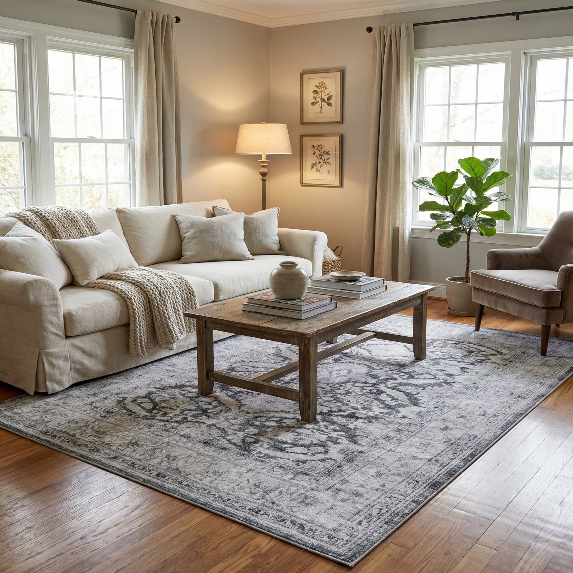 Primary color is Charcoal. Colors in this rug include: Charcoal, Ivory.