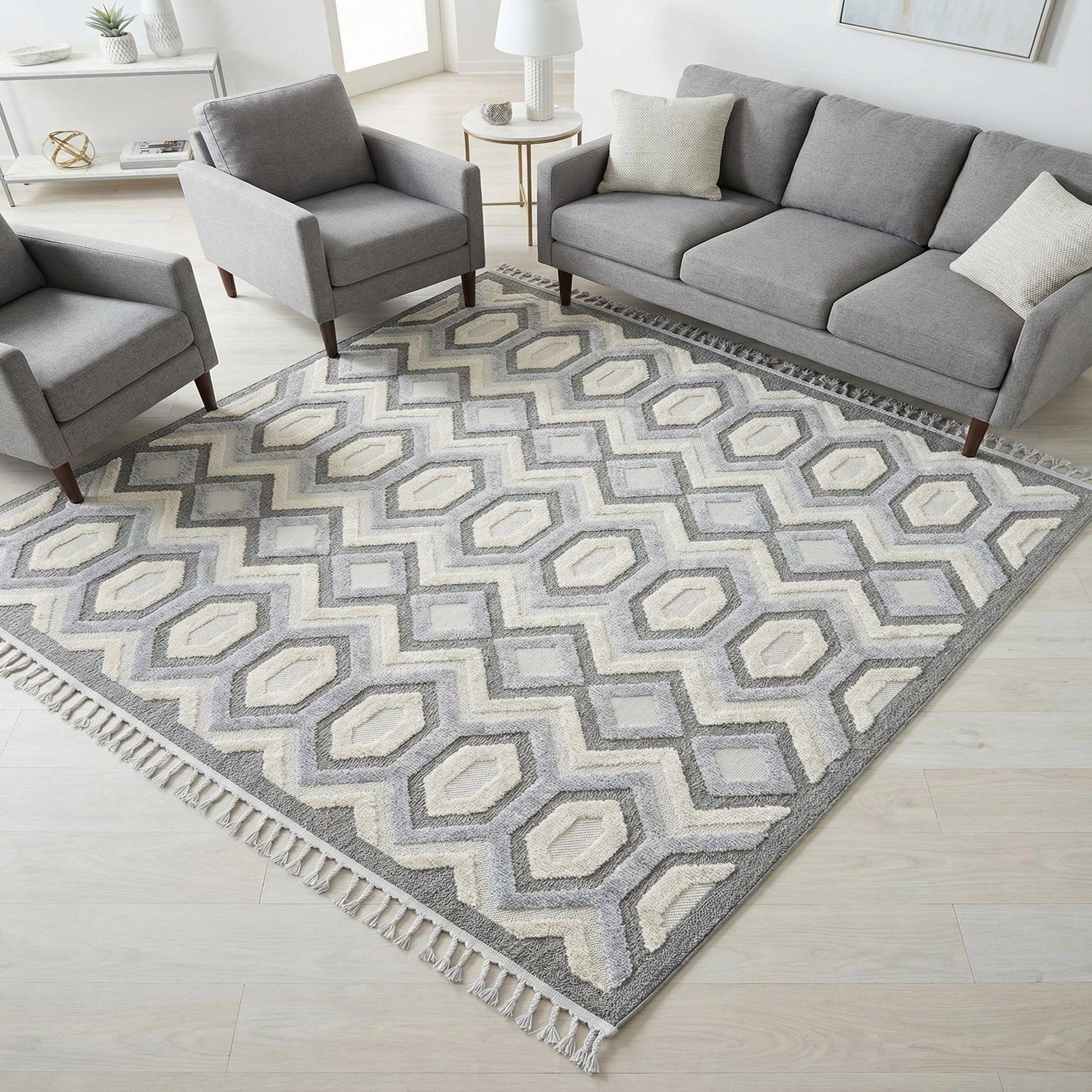 Primary color is Charcoal. Colors in this rug include: Charcoal, Beige, Gray.