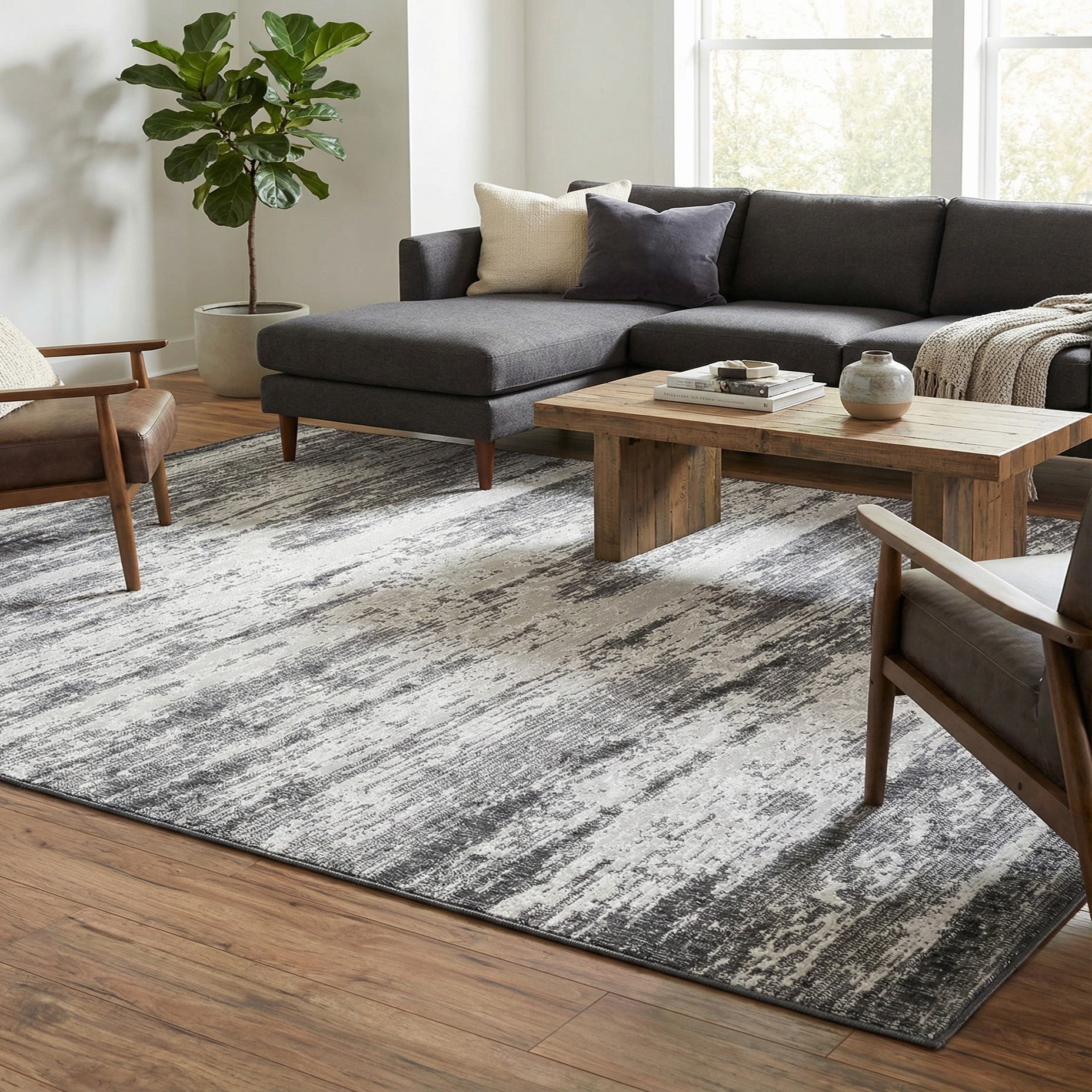 Primary color is Charcoal. Colors in this rug include: Charcoal, Ivory.