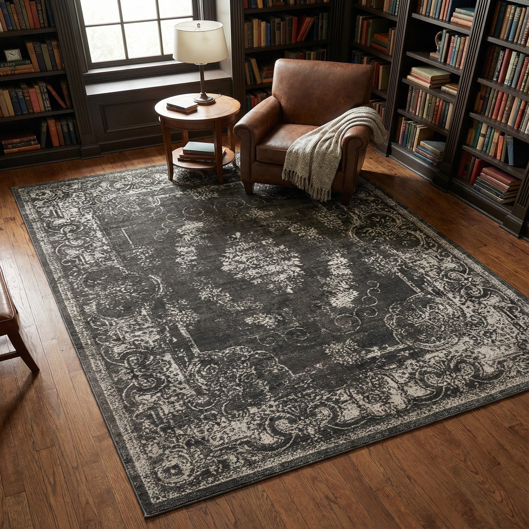 Primary color is Charcoal. Colors in this rug include: Charcoal, Gray, Ivory.