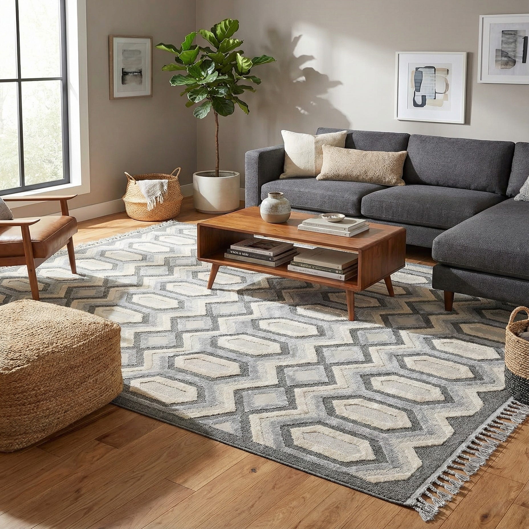 Primary color is Charcoal. Colors in this rug include: Charcoal, Beige, Gray.