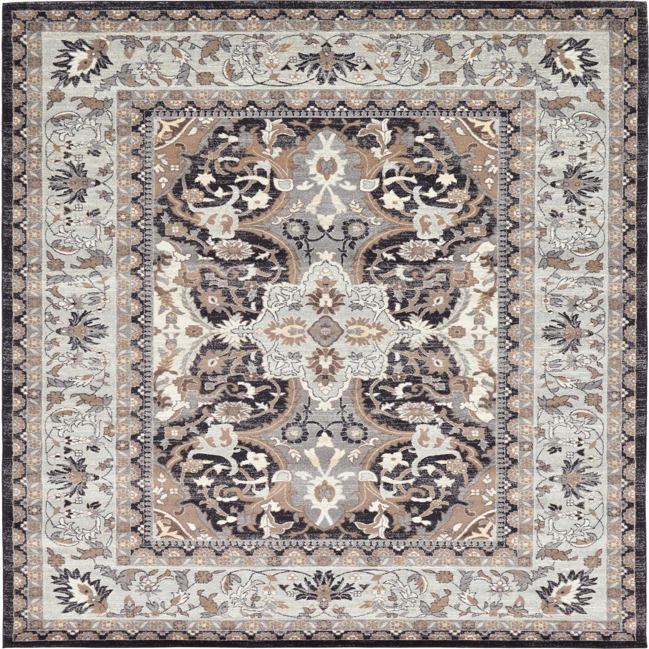 Primary color is Charcoal. Colors in this rug include: Charcoal, Black, Light Brown, Tan, Silver.