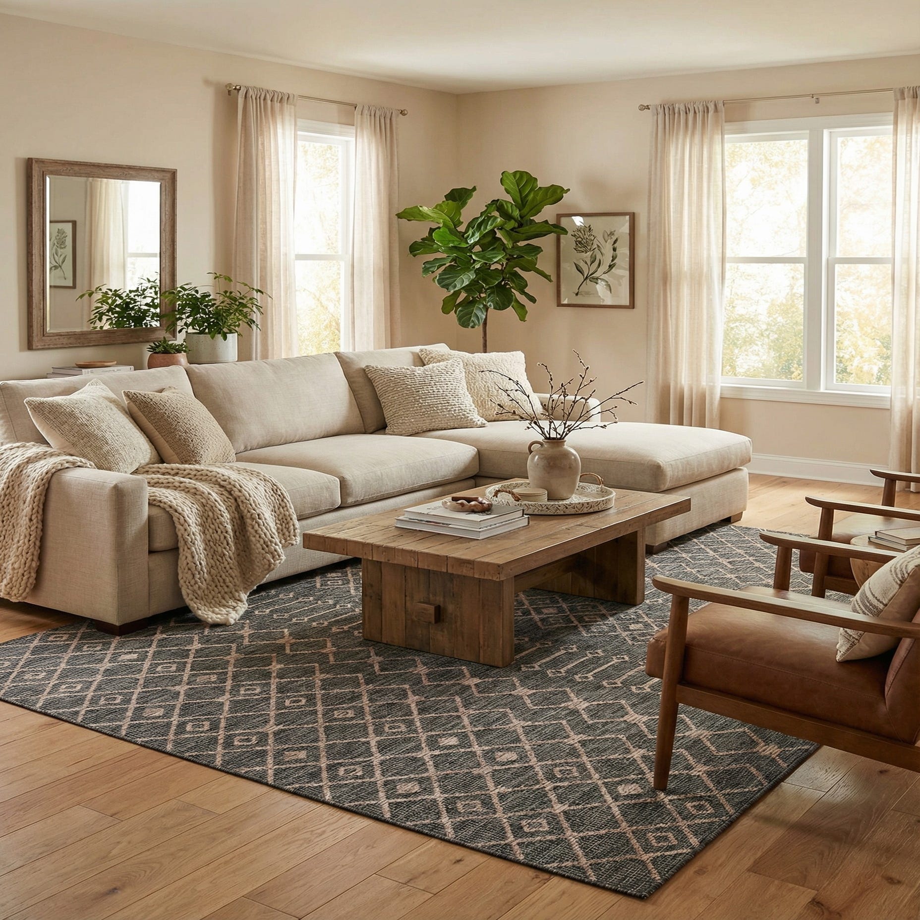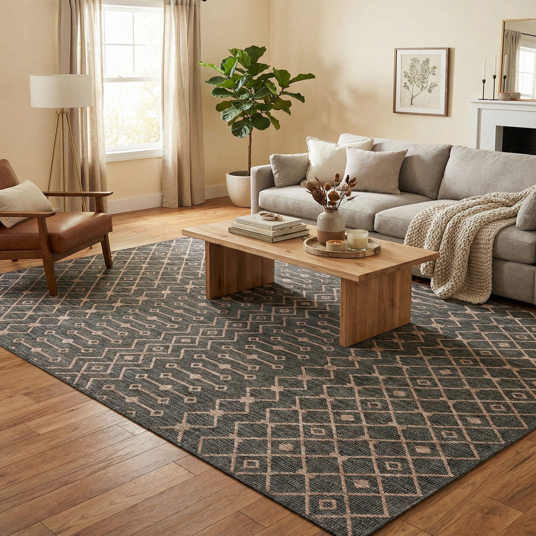 Primary color is Charcoal Gray. Colors in this rug include: Charcoal Gray, Natural.