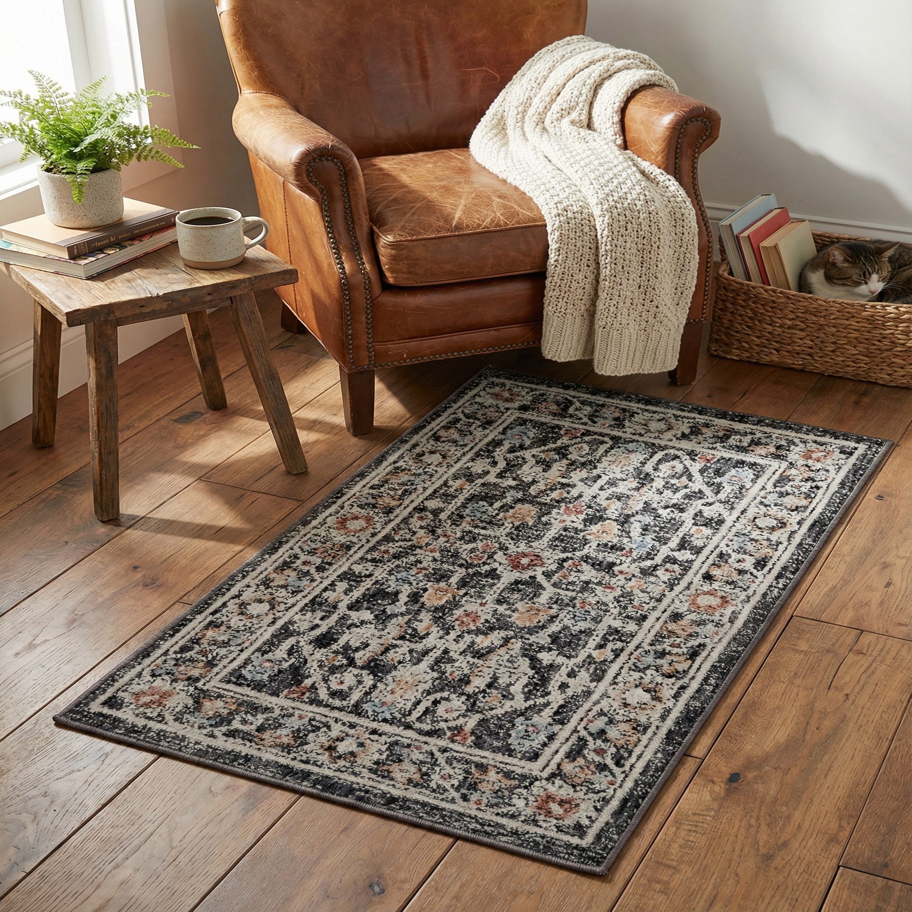 Primary color is Charcoal Gray. Colors in this rug include: Charcoal Gray, Gray, Ivory, Light Brown.