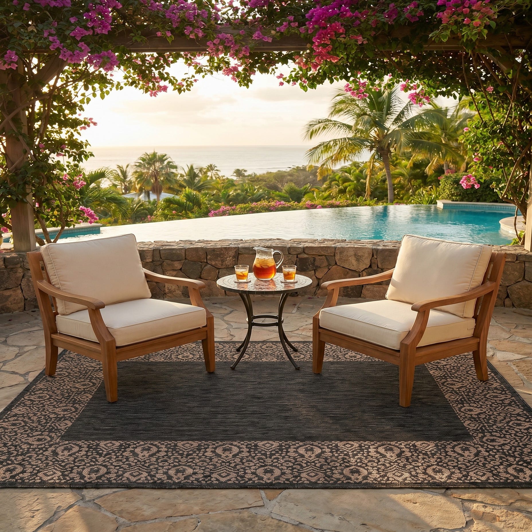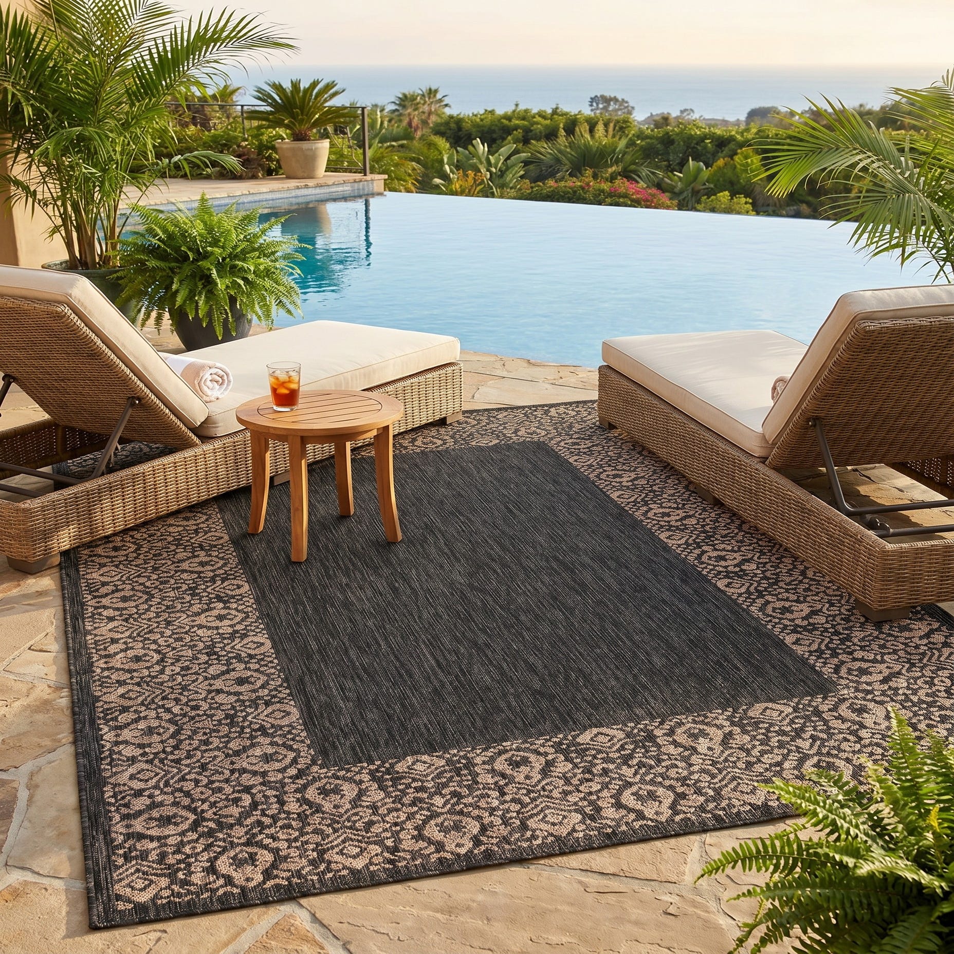 I LOVE this rug. It’s gorgeous. It fits my space perfectly and covers the imperfections of my patio that are waiting to be repaired. I’ve received so many compliments. My outdoor space has never been cozier and more for inviting. The best part is how quickly it dries after a rain. I am thoroughly impressed by the quality and craftsmanship of this rug.
