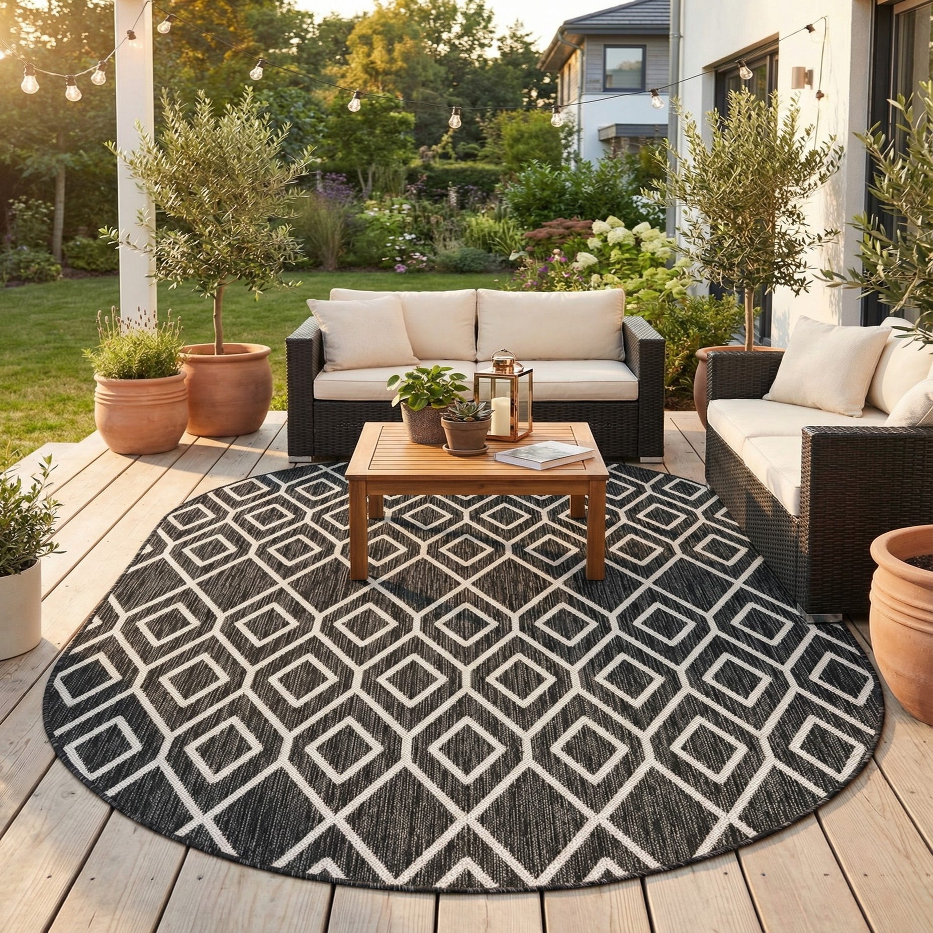 This suited my needs perfectly for a little outdoor breakfast area. The pattern mimics my garden lattice pattern. These photos were taken at night but it shows up well. Dries out quickly after rain