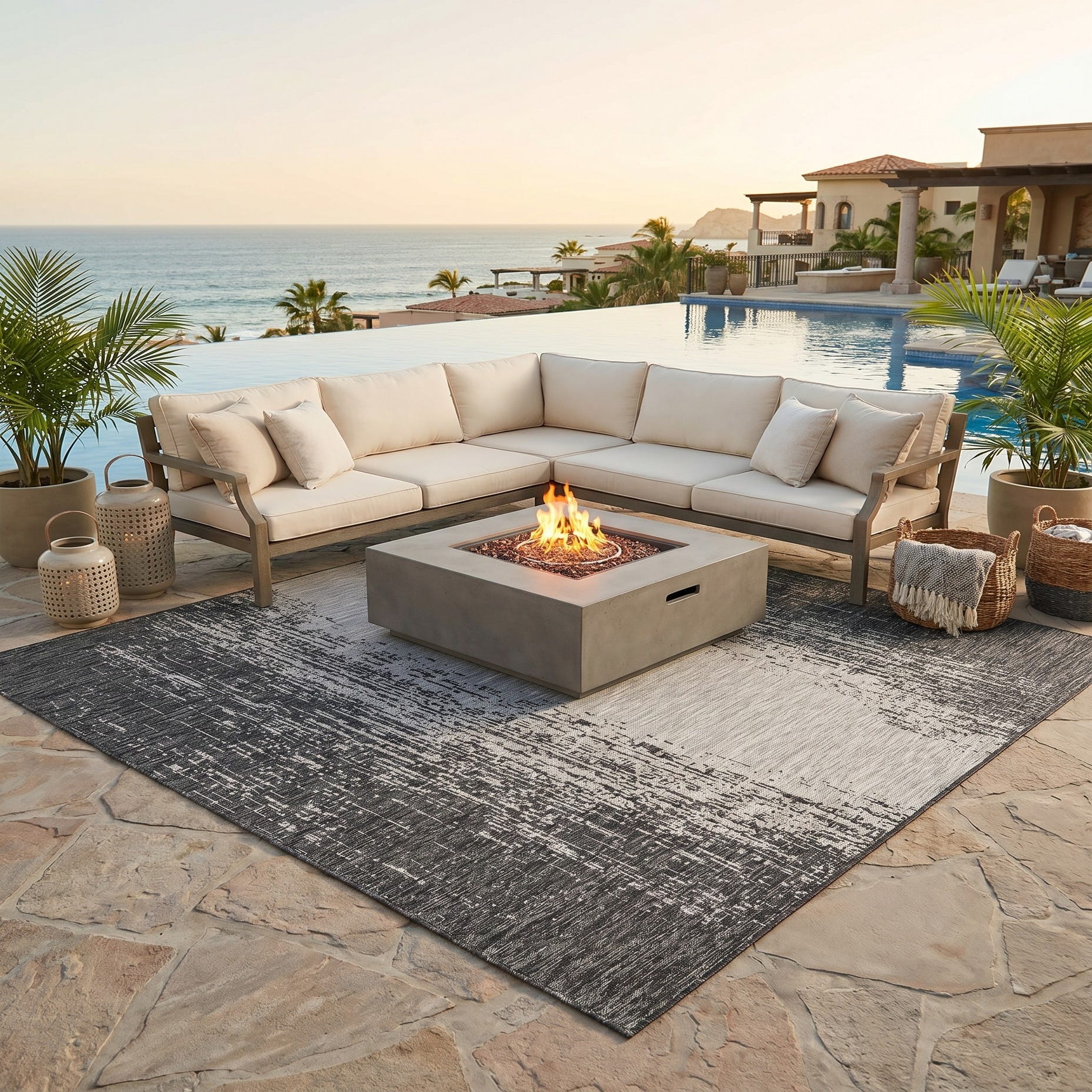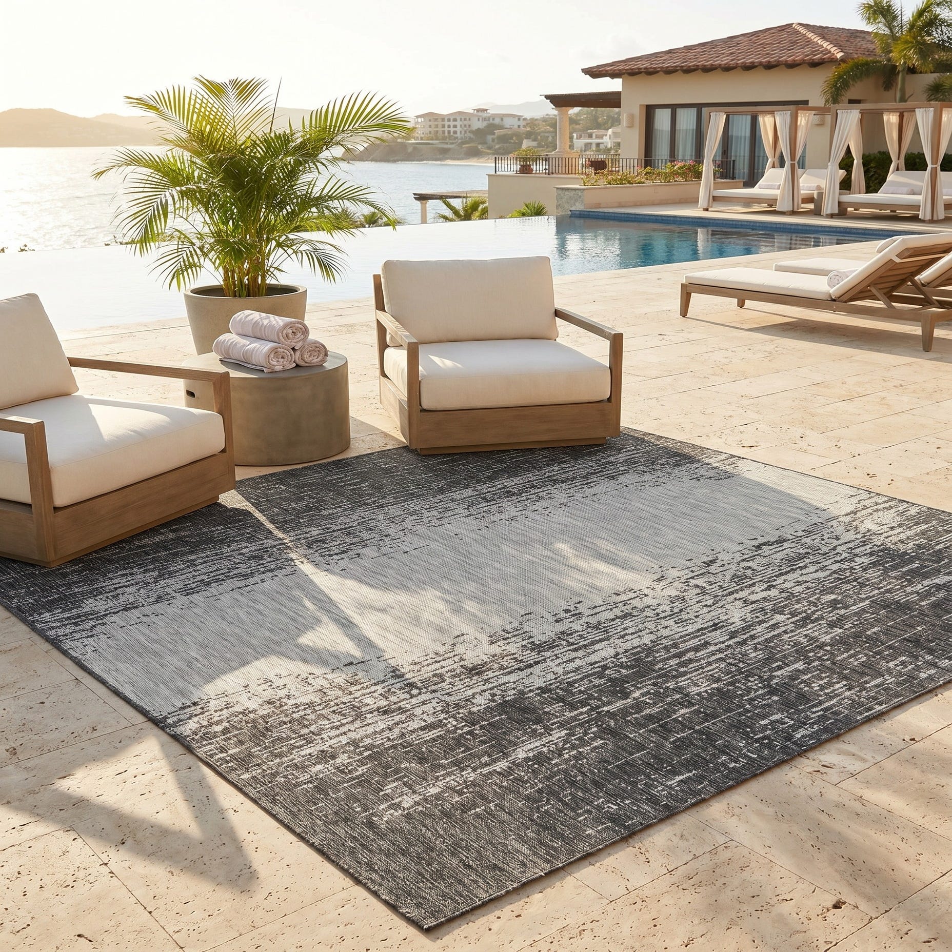 Love the contemporary look of this rug! We are so happy we chose this to accent the blue of our pool with our living area on our lanai. We still are going to add a few more pillows but love the rug to add color.