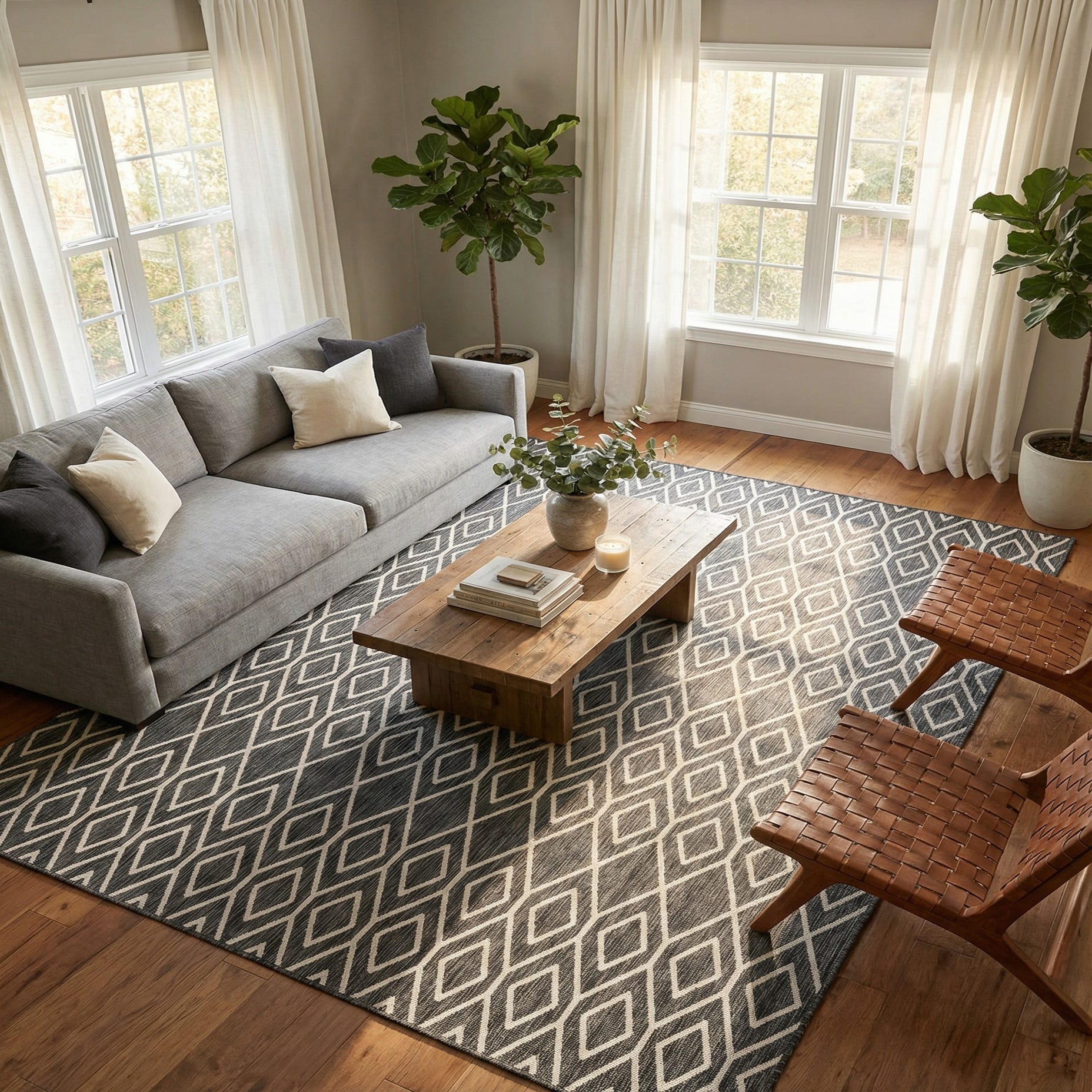 Primary color is Charcoal Gray. Colors in this rug include: Charcoal Gray, Ivory.