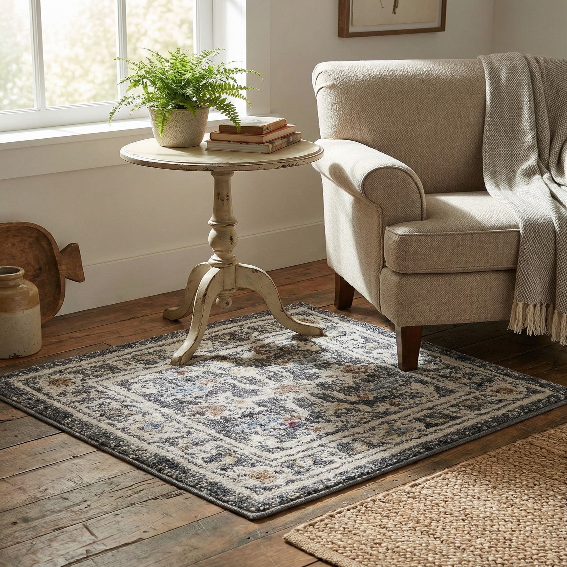 Primary color is Charcoal Gray. Colors in this rug include: Charcoal Gray, Gray, Ivory, Light Brown.