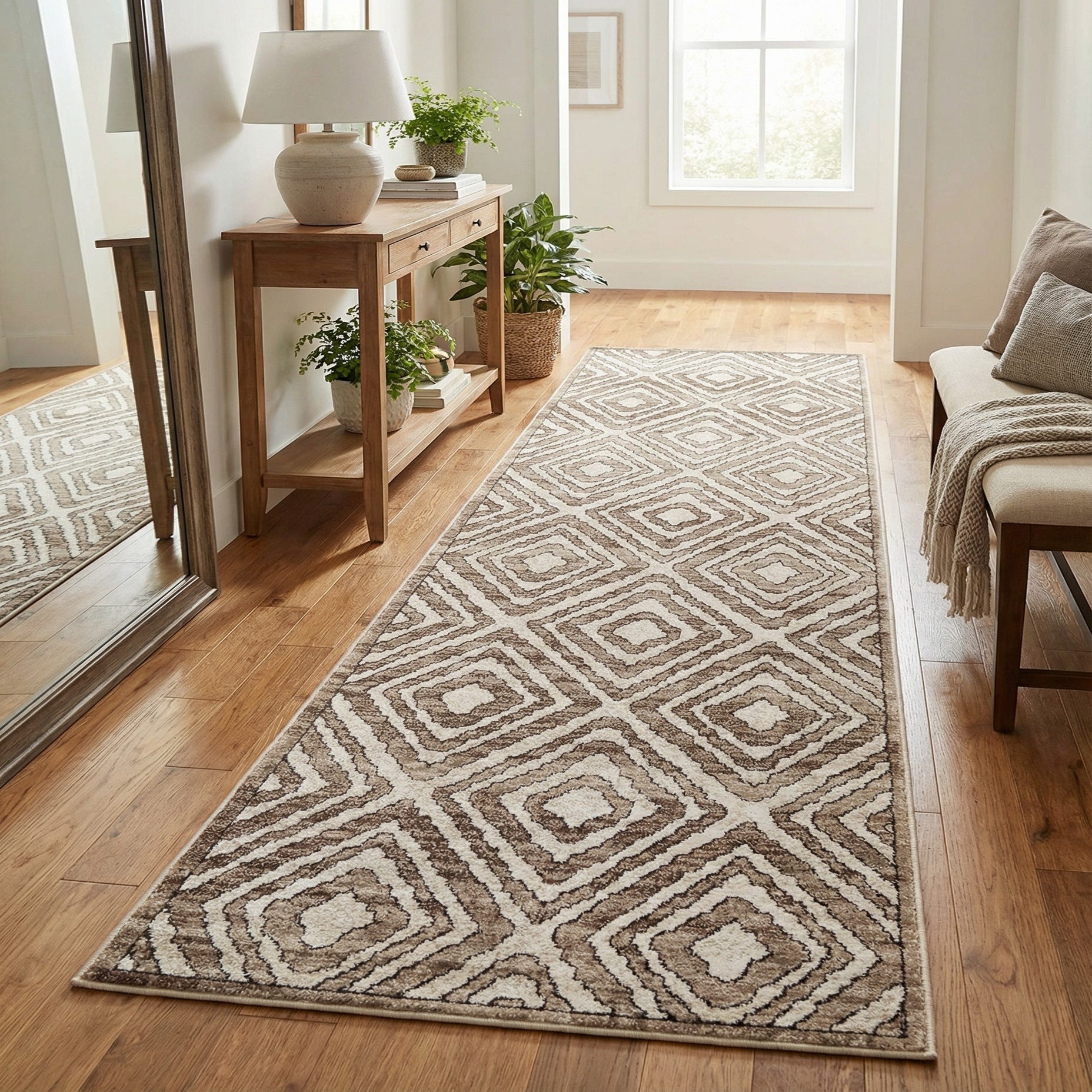 Primary color is Chocolate Brown. Colors in this rug include: Chocolate Brown, Beige, Black.