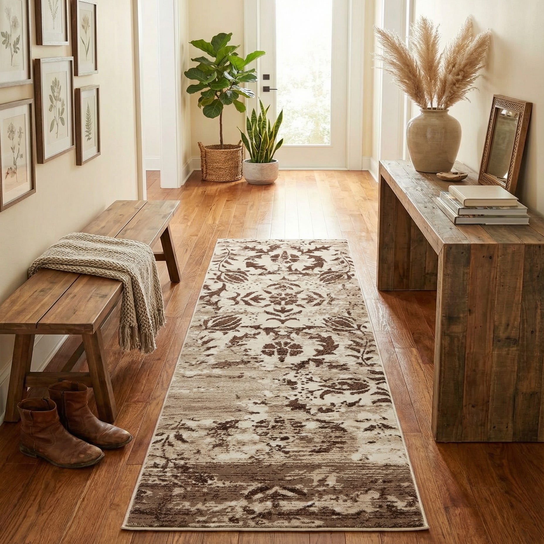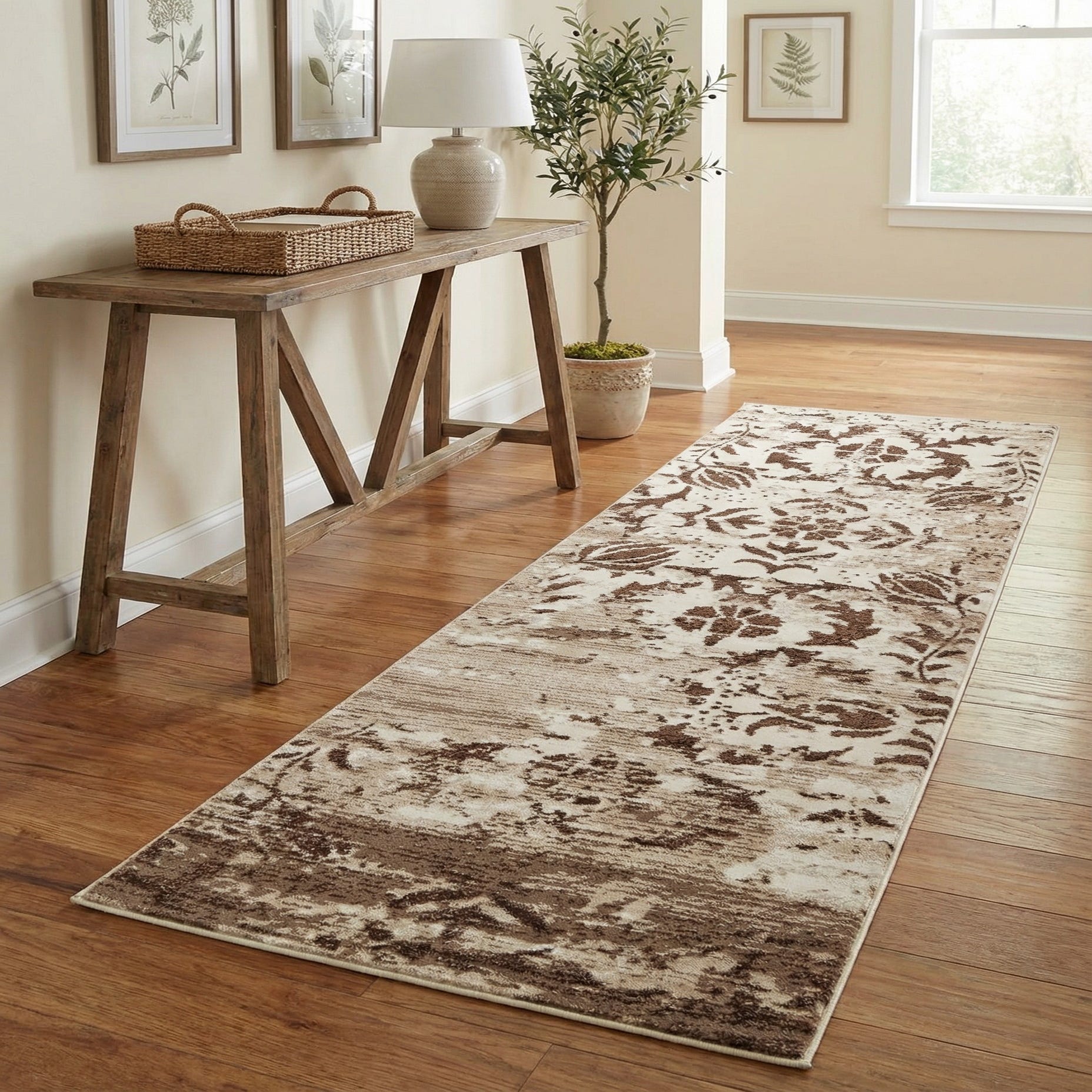 Primary color is Chocolate Brown. Colors in this rug include: Chocolate Brown, Beige, Cream, Light Brown.