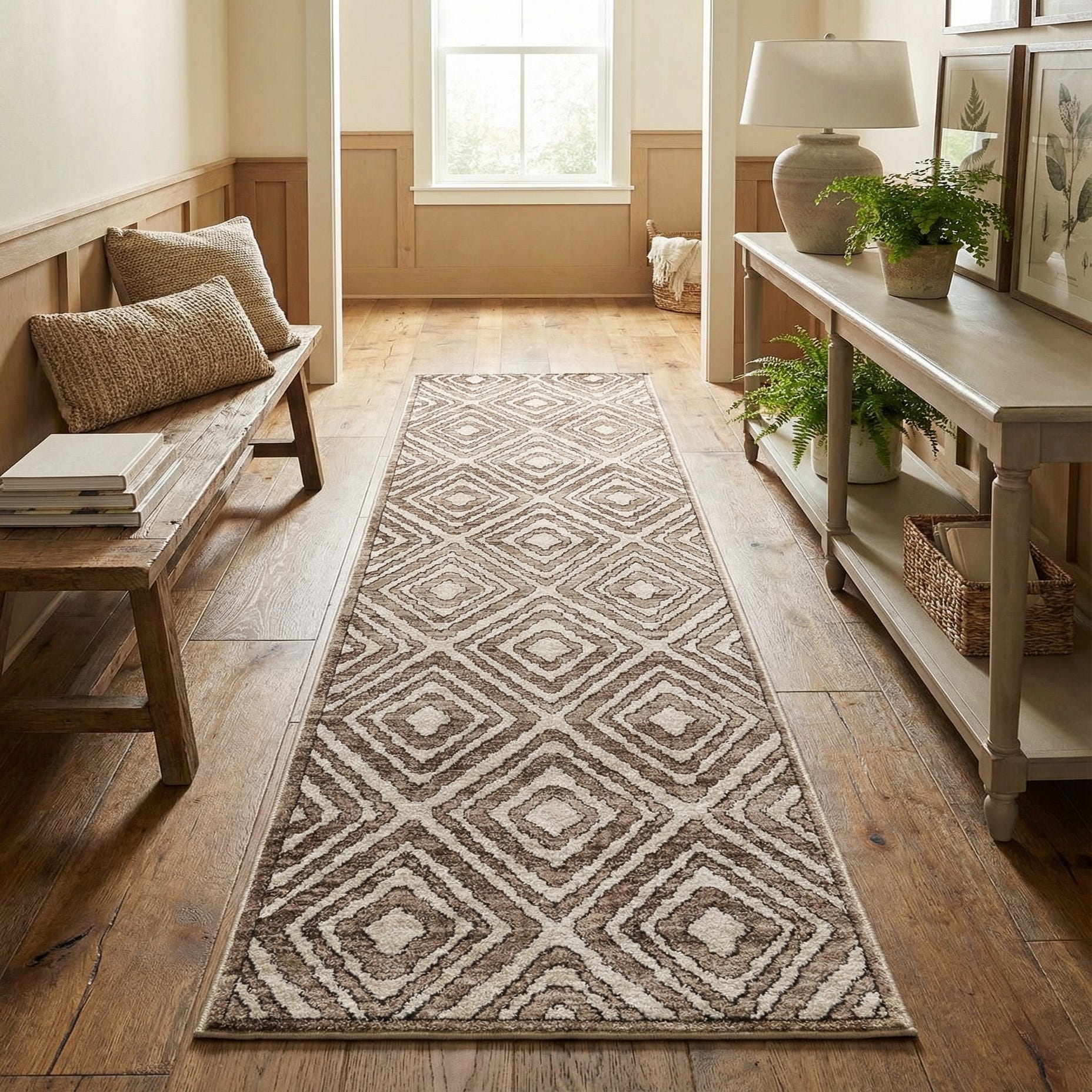 Primary color is Chocolate Brown. Colors in this rug include: Chocolate Brown, Beige, Black.