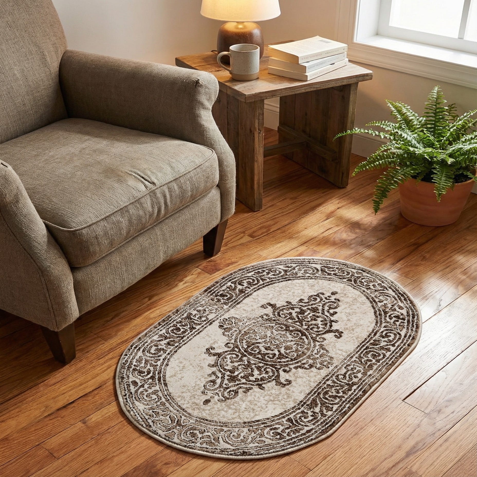 Primary color is Chocolate Brown. Colors in this rug include: Chocolate Brown, Beige, Black.