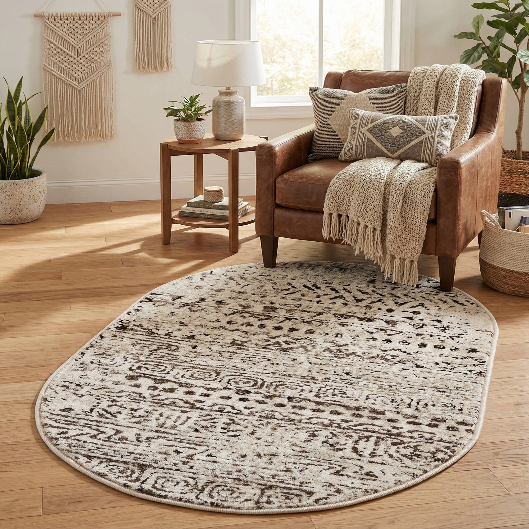 Primary color is Chocolate Brown. Colors in this rug include: Chocolate Brown, Beige.