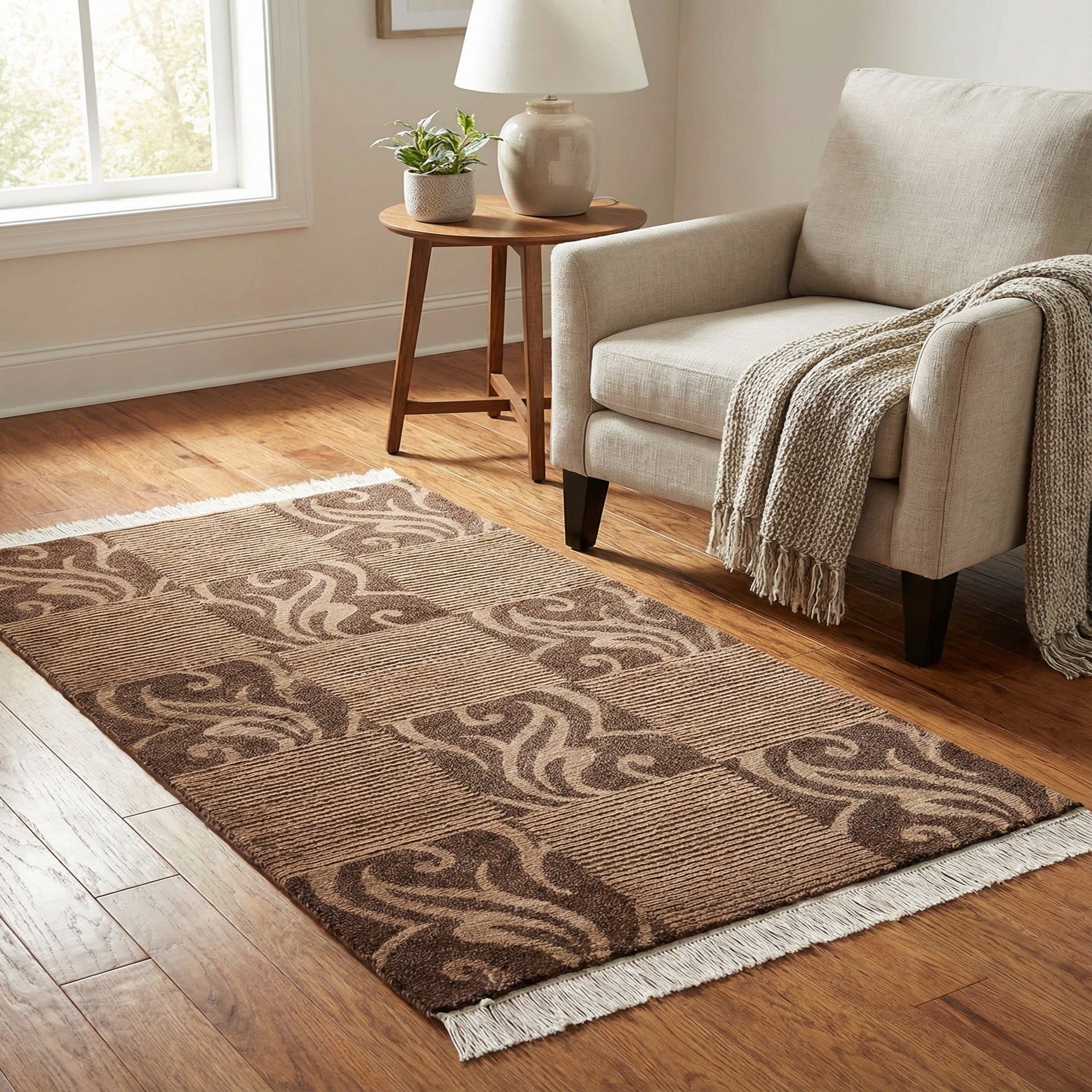 Primary color is Chocolate Brown. Colors in this rug include: Chocolate Brown, Brown, Light Brown.