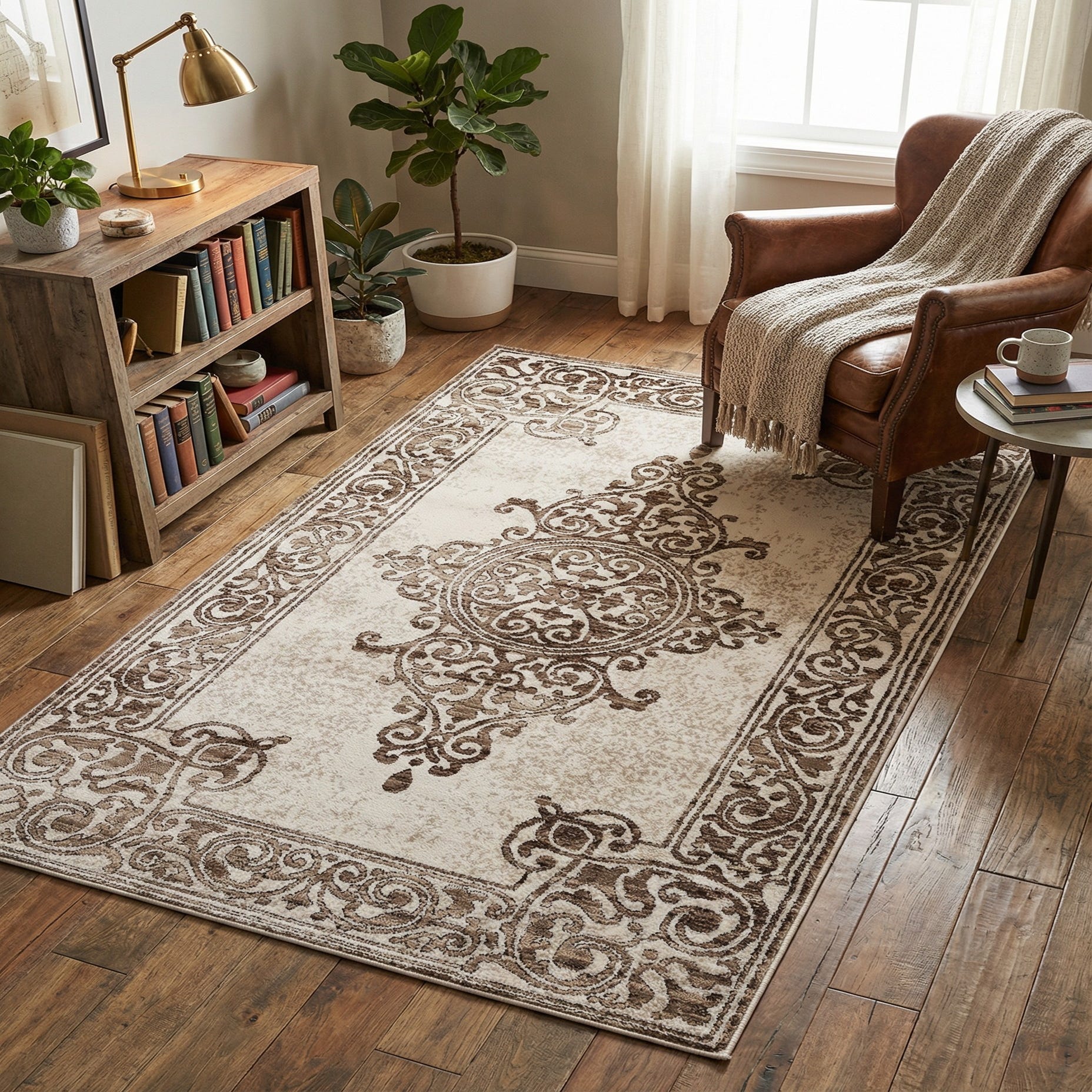 Primary color is Chocolate Brown. Colors in this rug include: Chocolate Brown, Beige, Black.
