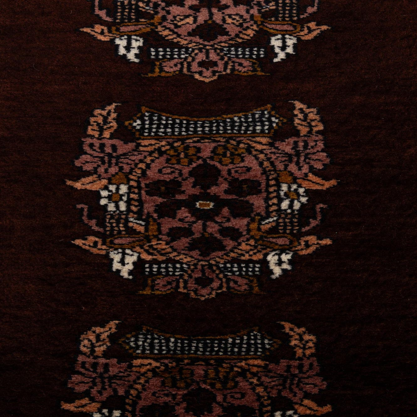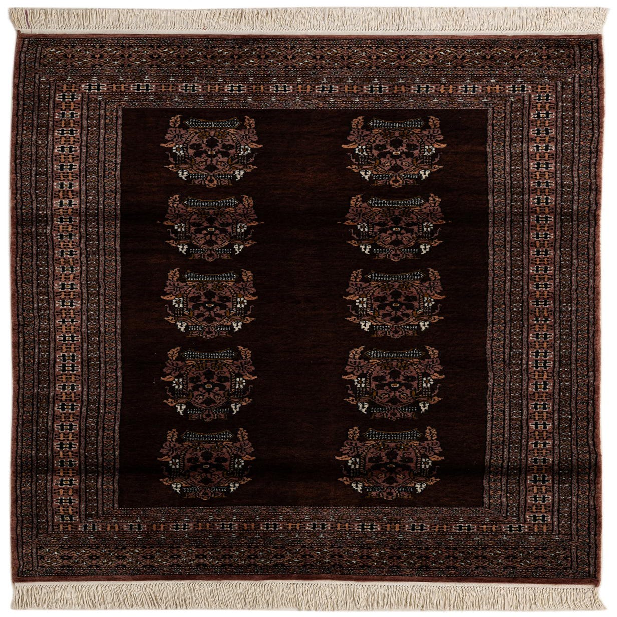 Primary color is Chocolate Brown. Colors in this rug include: Chocolate Brown, Beige, Black, Brown, Ivory, Gold.