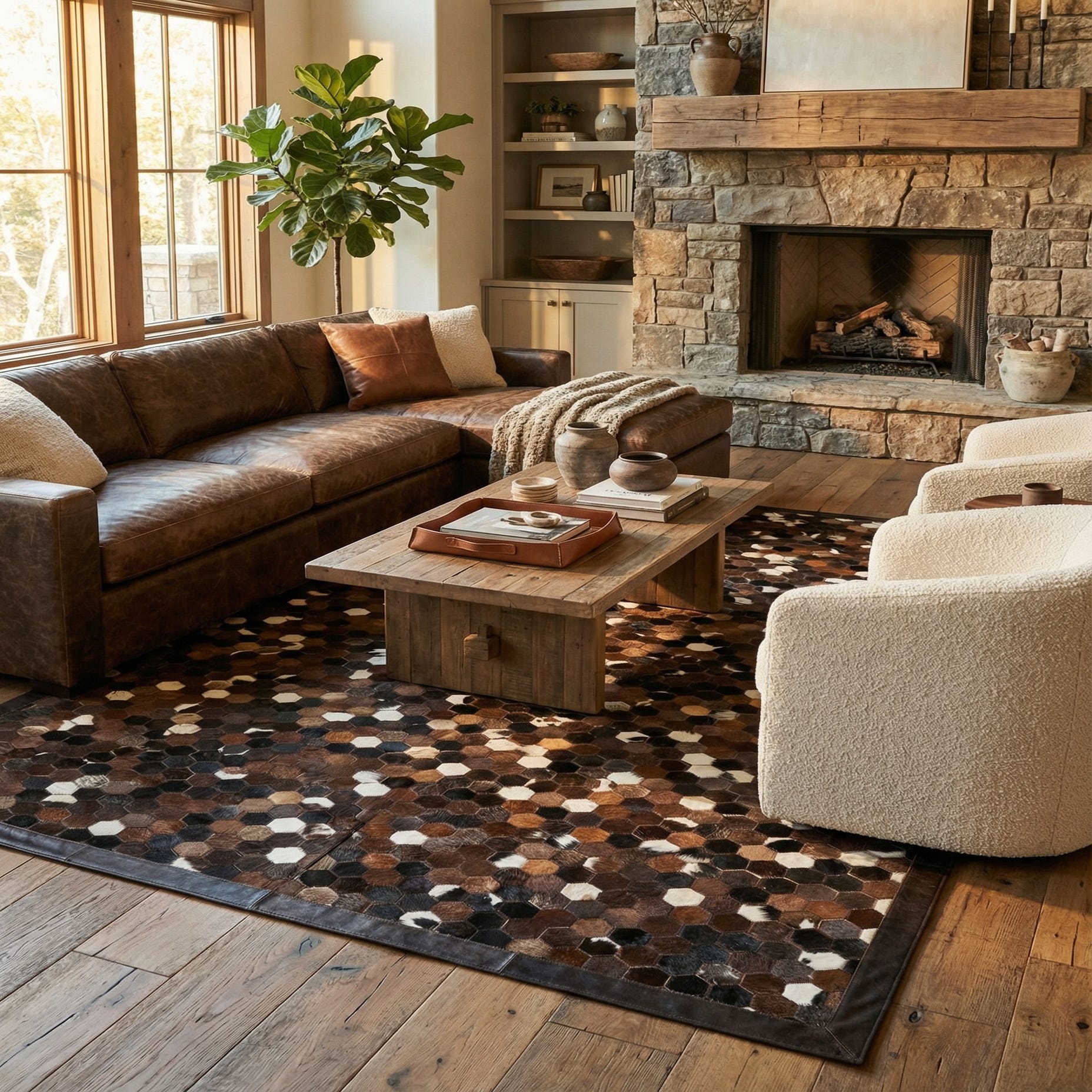 Primary color is Chocolate Brown. Colors in this rug include: Chocolate Brown, Beige, Black, Brown, Ivory, Light Brown, Cream.
