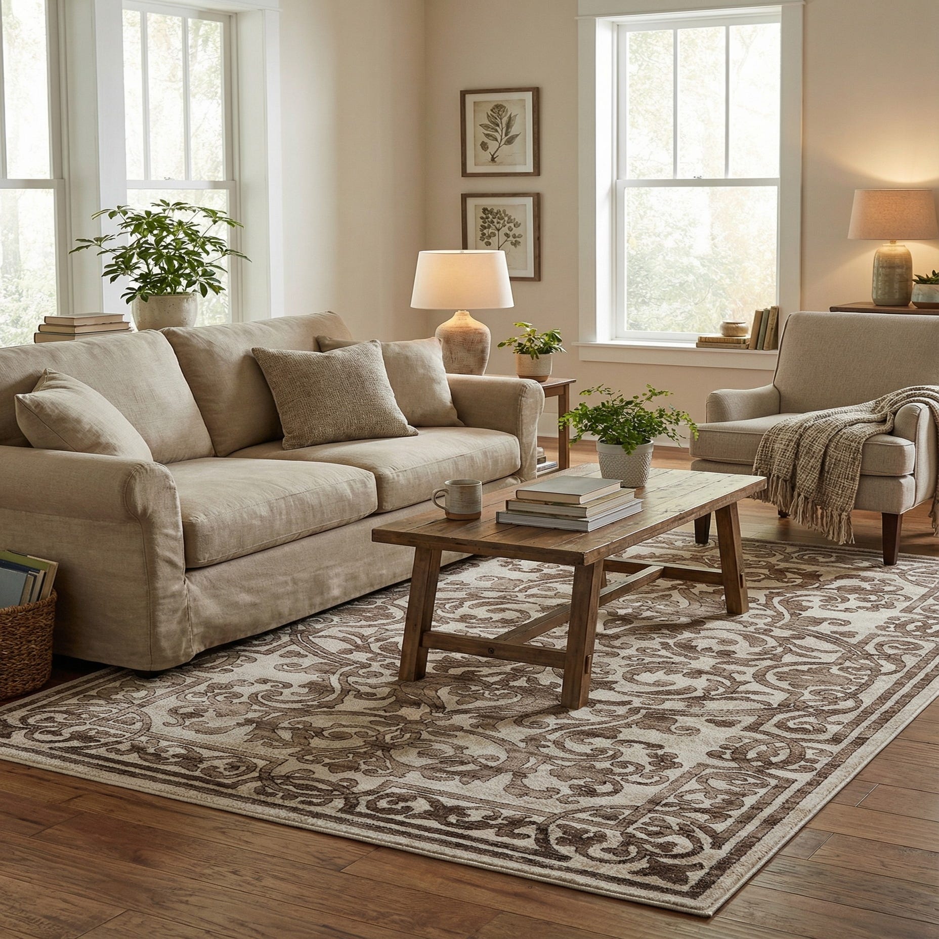 Primary color is Chocolate Brown. Colors in this rug include: Chocolate Brown, Beige, Black.