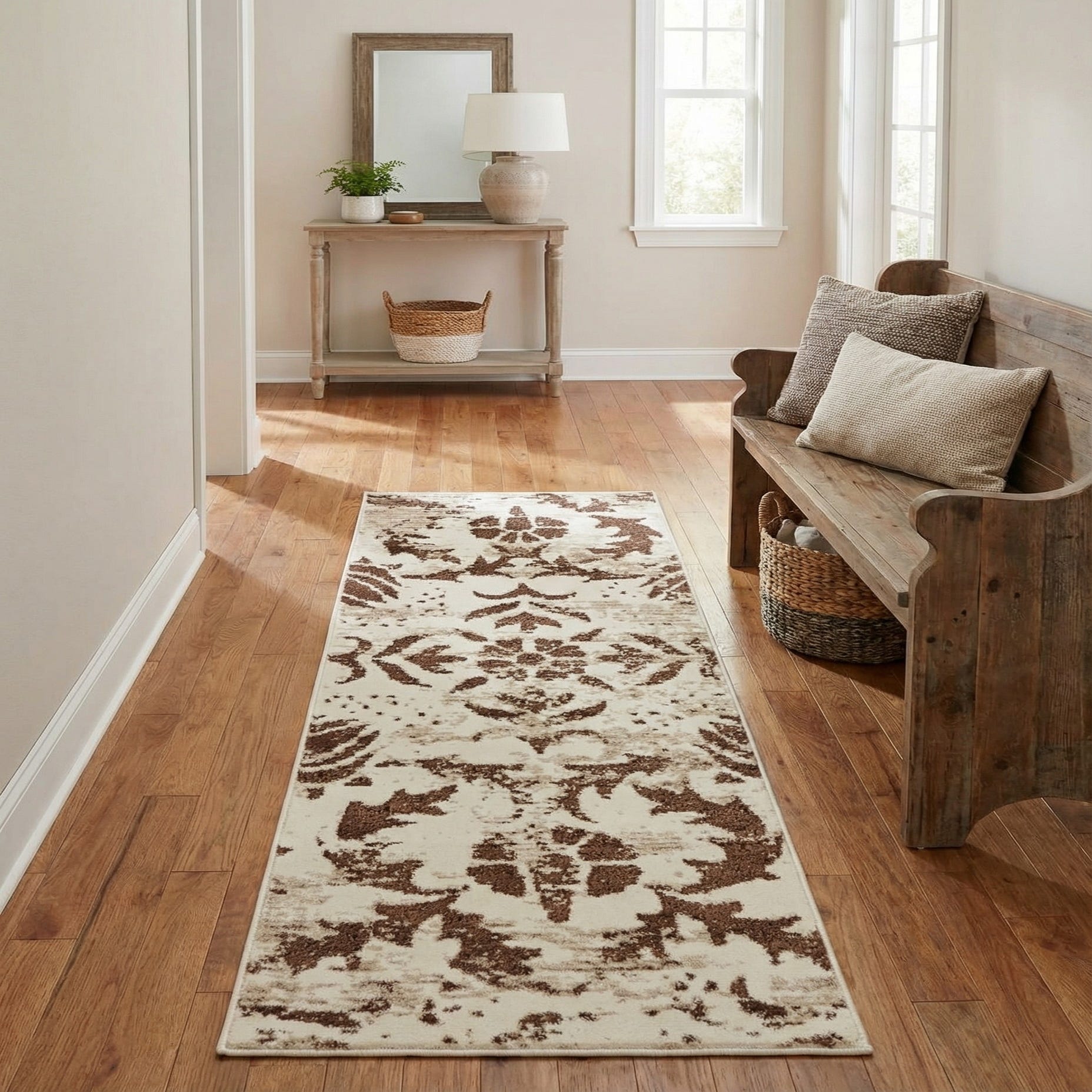 Primary color is Chocolate Brown. Colors in this rug include: Chocolate Brown, Beige, Cream, Light Brown.