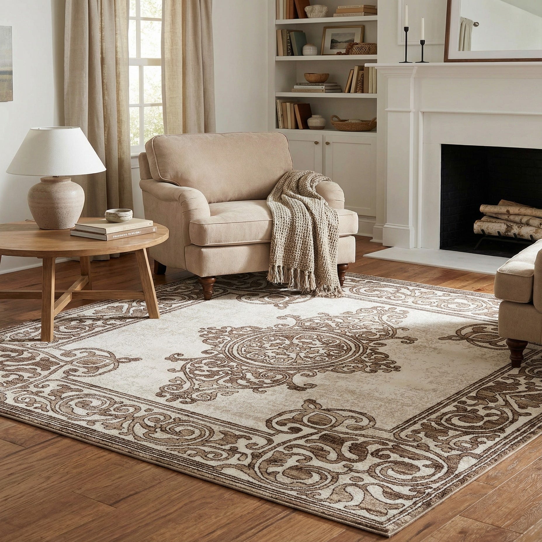 Primary color is Chocolate Brown. Colors in this rug include: Chocolate Brown, Beige, Black.