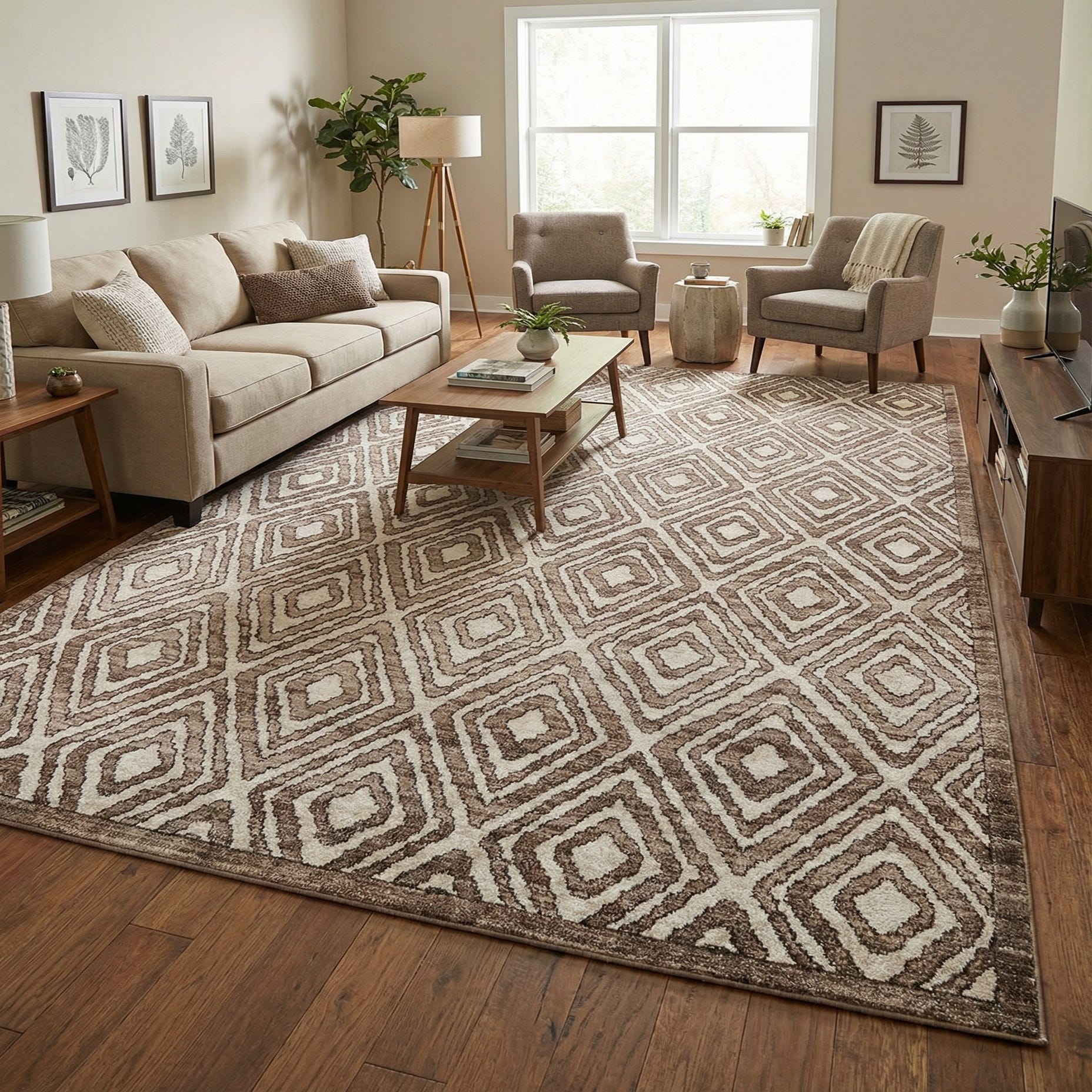 Primary color is Chocolate Brown. Colors in this rug include: Chocolate Brown, Beige, Black.