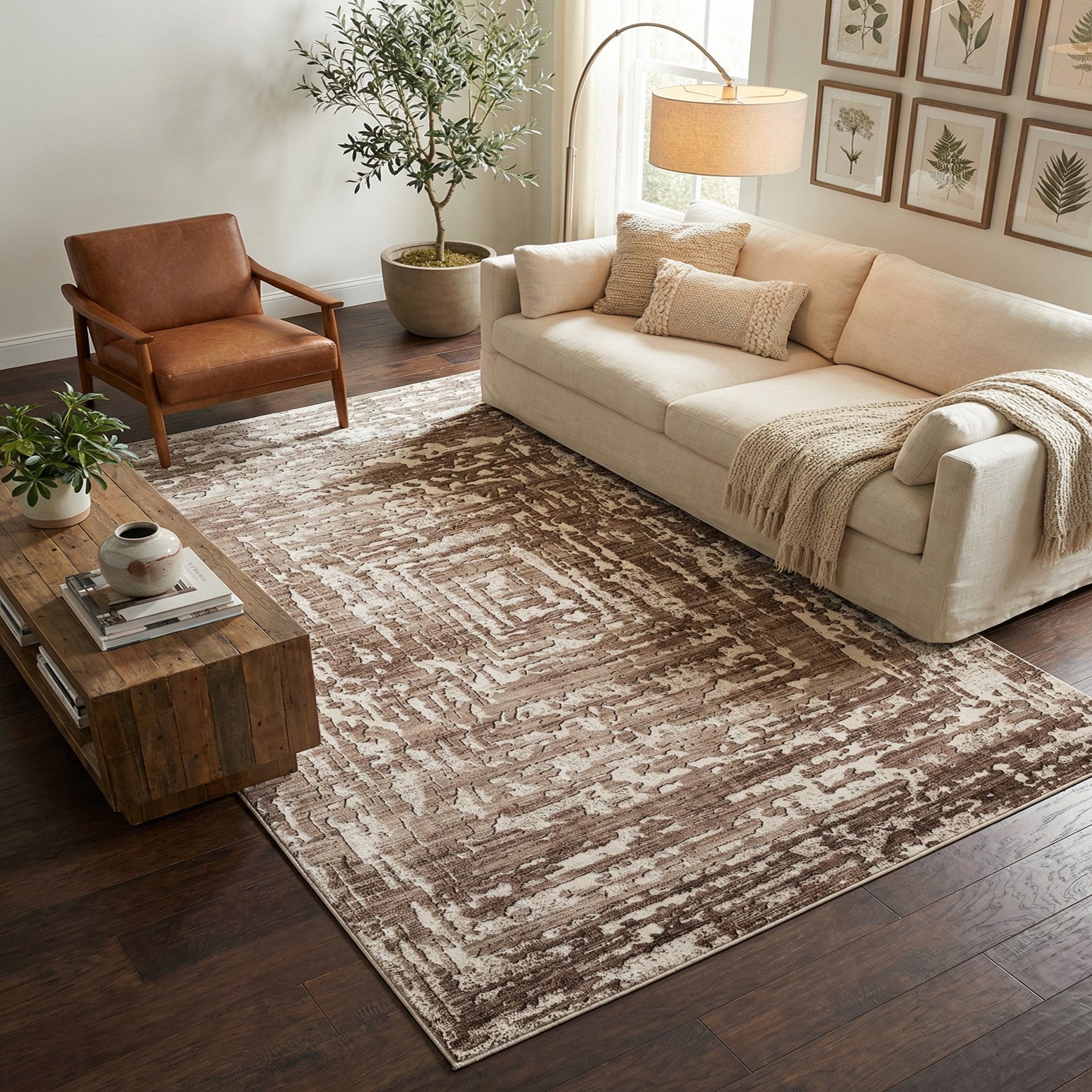 Primary color is Chocolate Brown. Colors in this rug include: Chocolate Brown, Beige, Black.