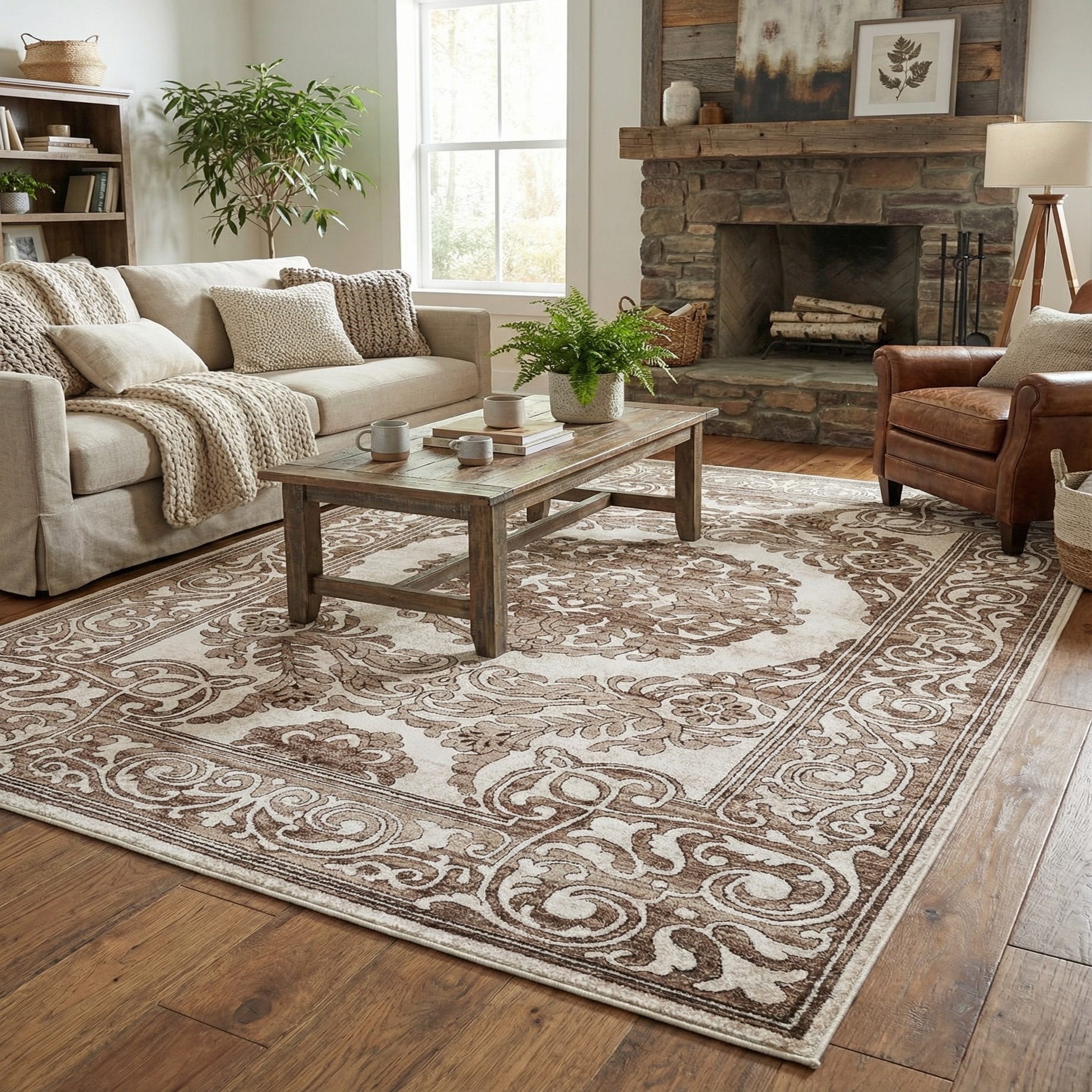 Primary color is Chocolate Brown. Colors in this rug include: Chocolate Brown, Beige, Black.