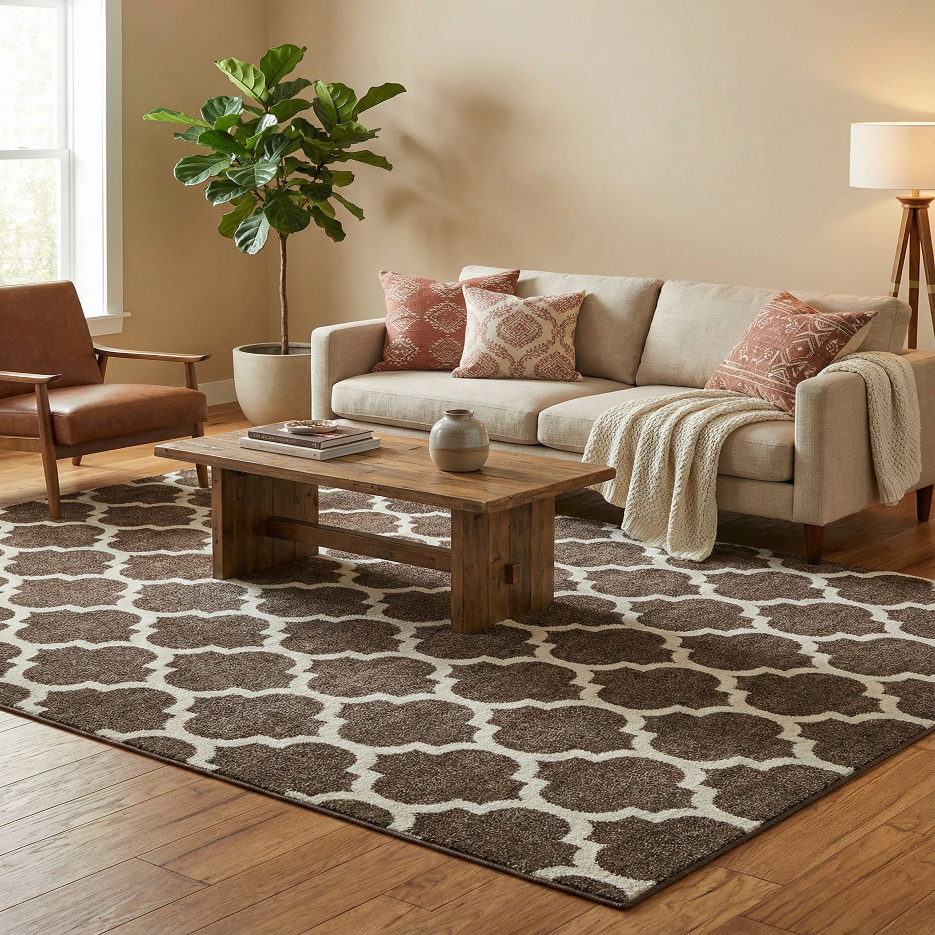 Primary color is Chocolate Brown. Colors in this rug include: Chocolate Brown, Beige.
