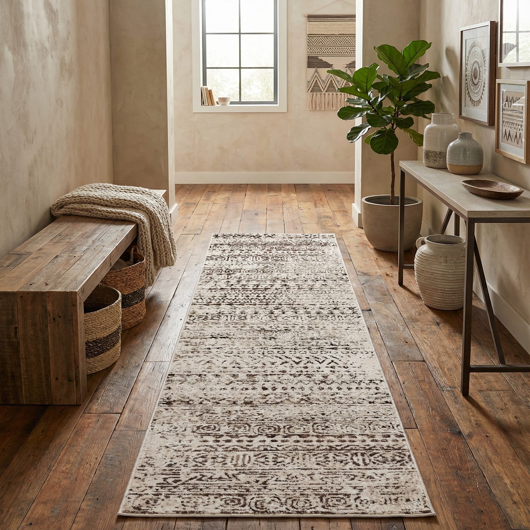 Primary color is Chocolate Brown. Colors in this rug include: Chocolate Brown, Beige.