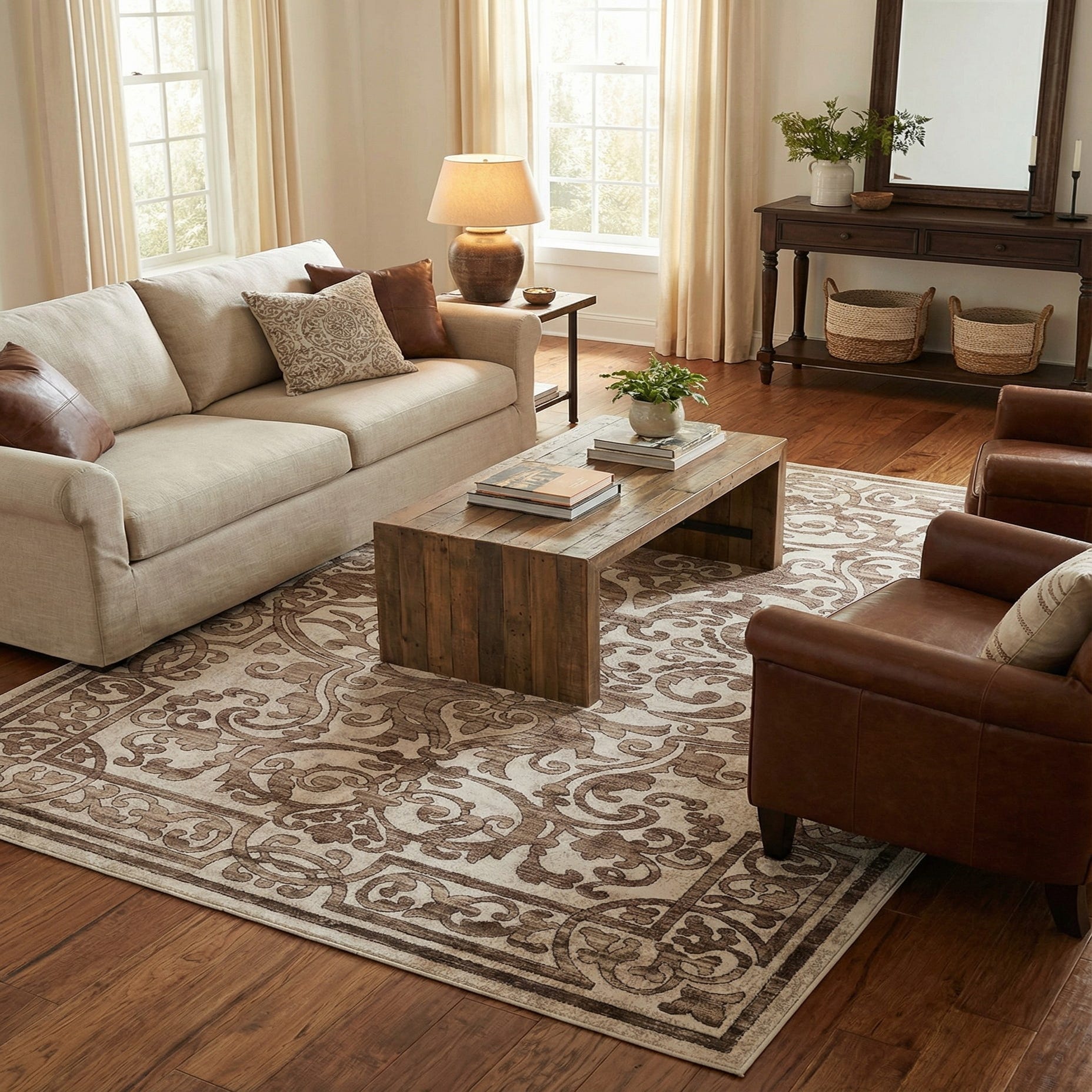 Primary color is Chocolate Brown. Colors in this rug include: Chocolate Brown, Black, Beige.
