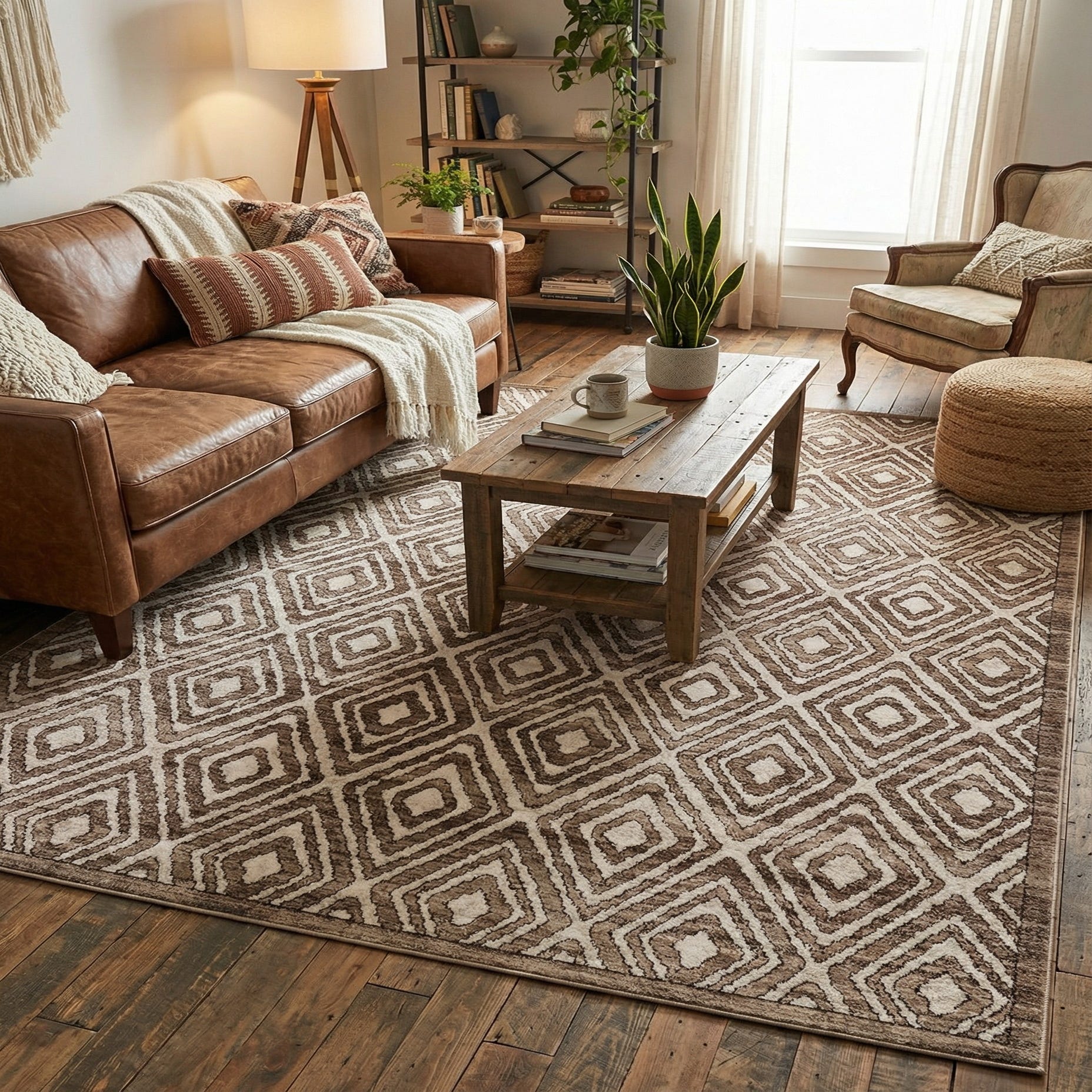 Primary color is Chocolate Brown. Colors in this rug include: Chocolate Brown, Beige, Black.