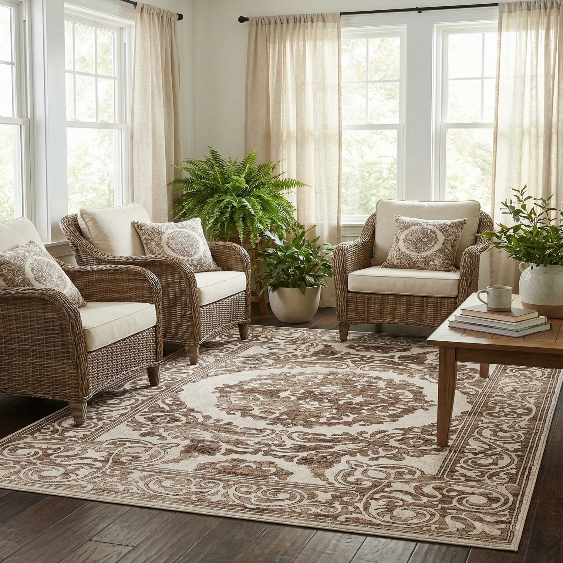 Primary color is Chocolate Brown. Colors in this rug include: Chocolate Brown, Beige, Black.