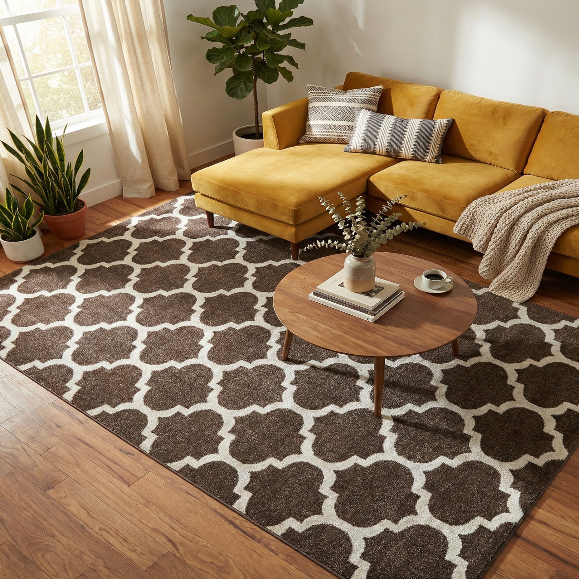Primary color is Chocolate Brown. Colors in this rug include: Chocolate Brown, Beige.