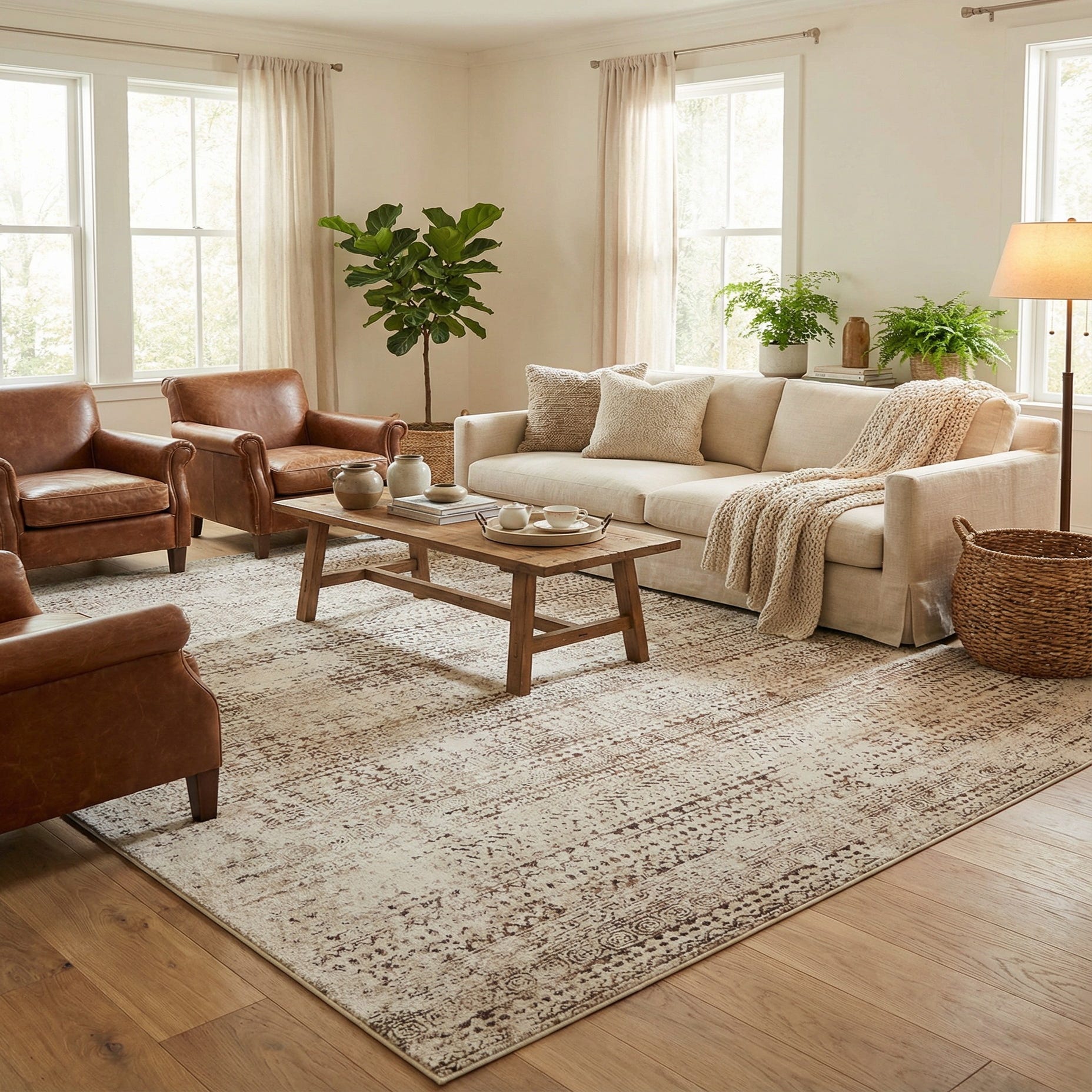 Primary color is Chocolate Brown. Colors in this rug include: Chocolate Brown, Beige.