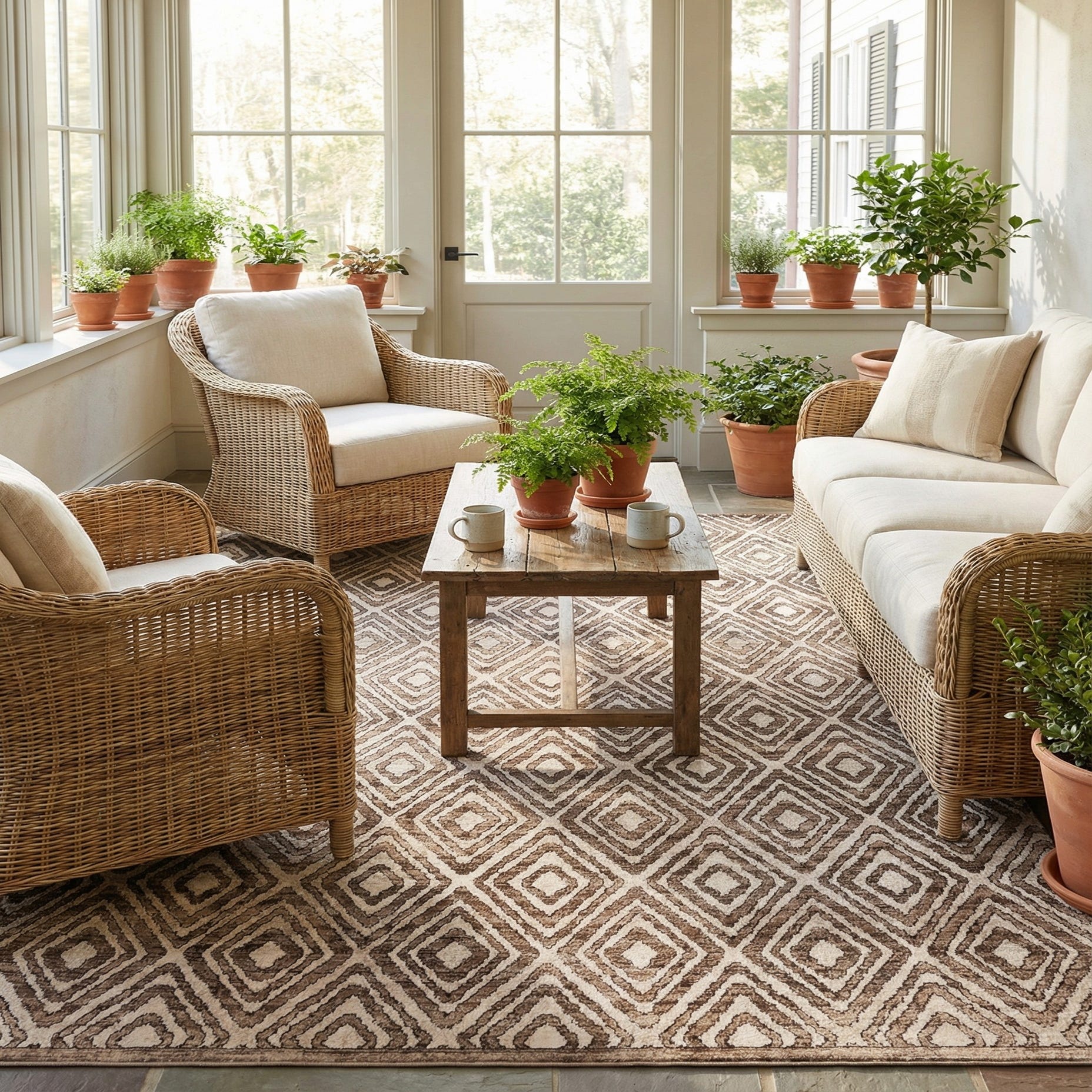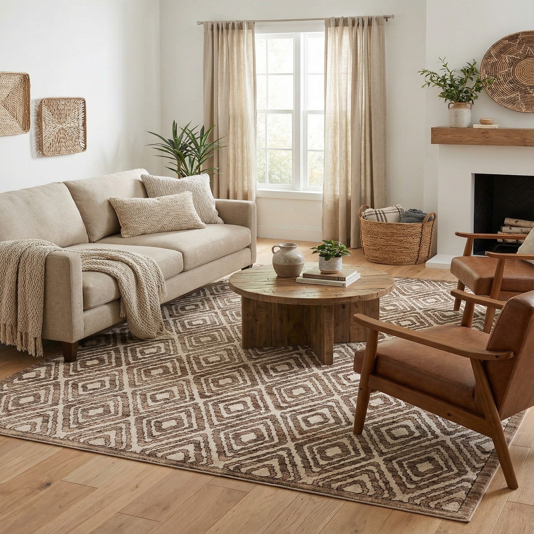 Primary color is Chocolate Brown. Colors in this rug include: Chocolate Brown, Beige, Black.